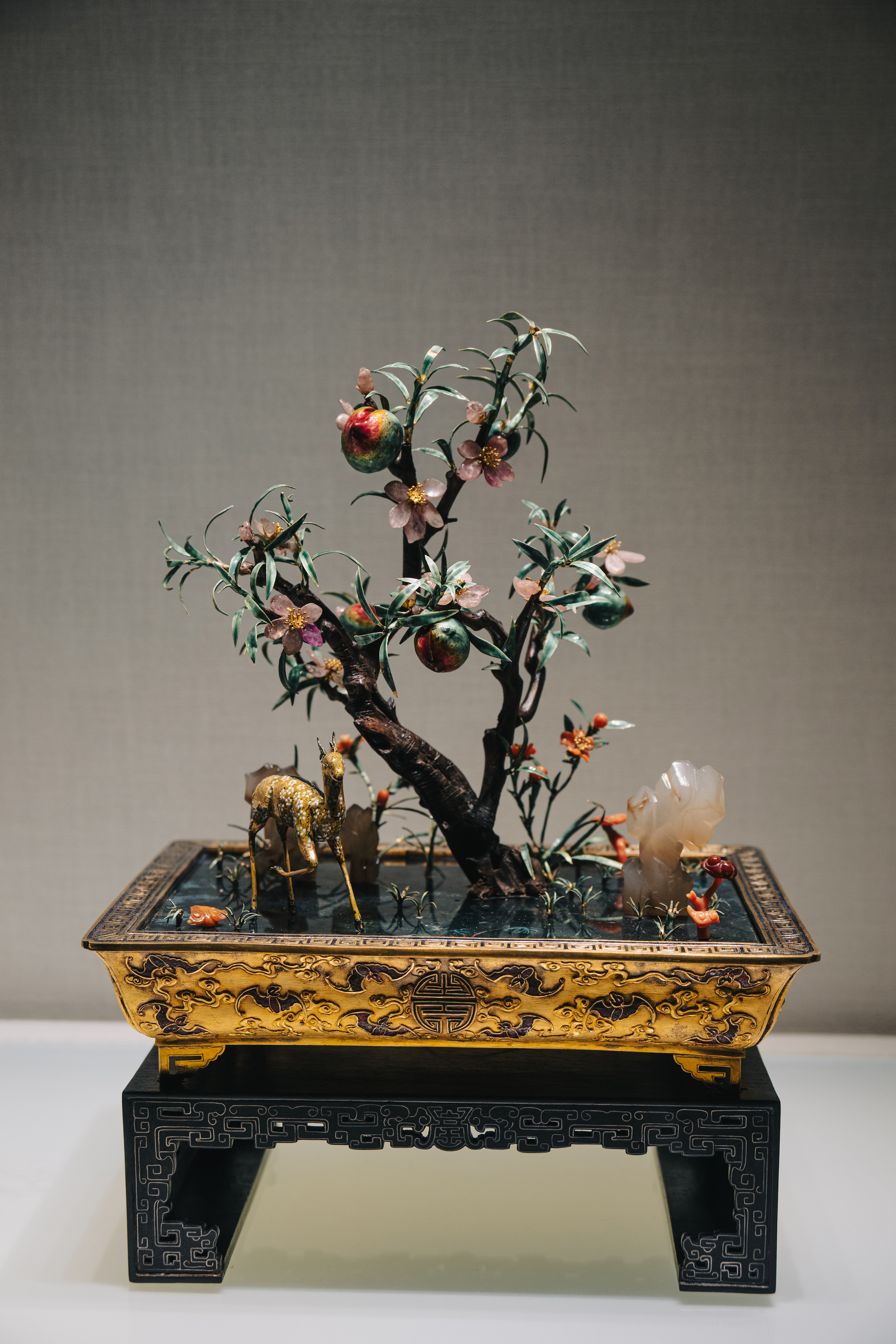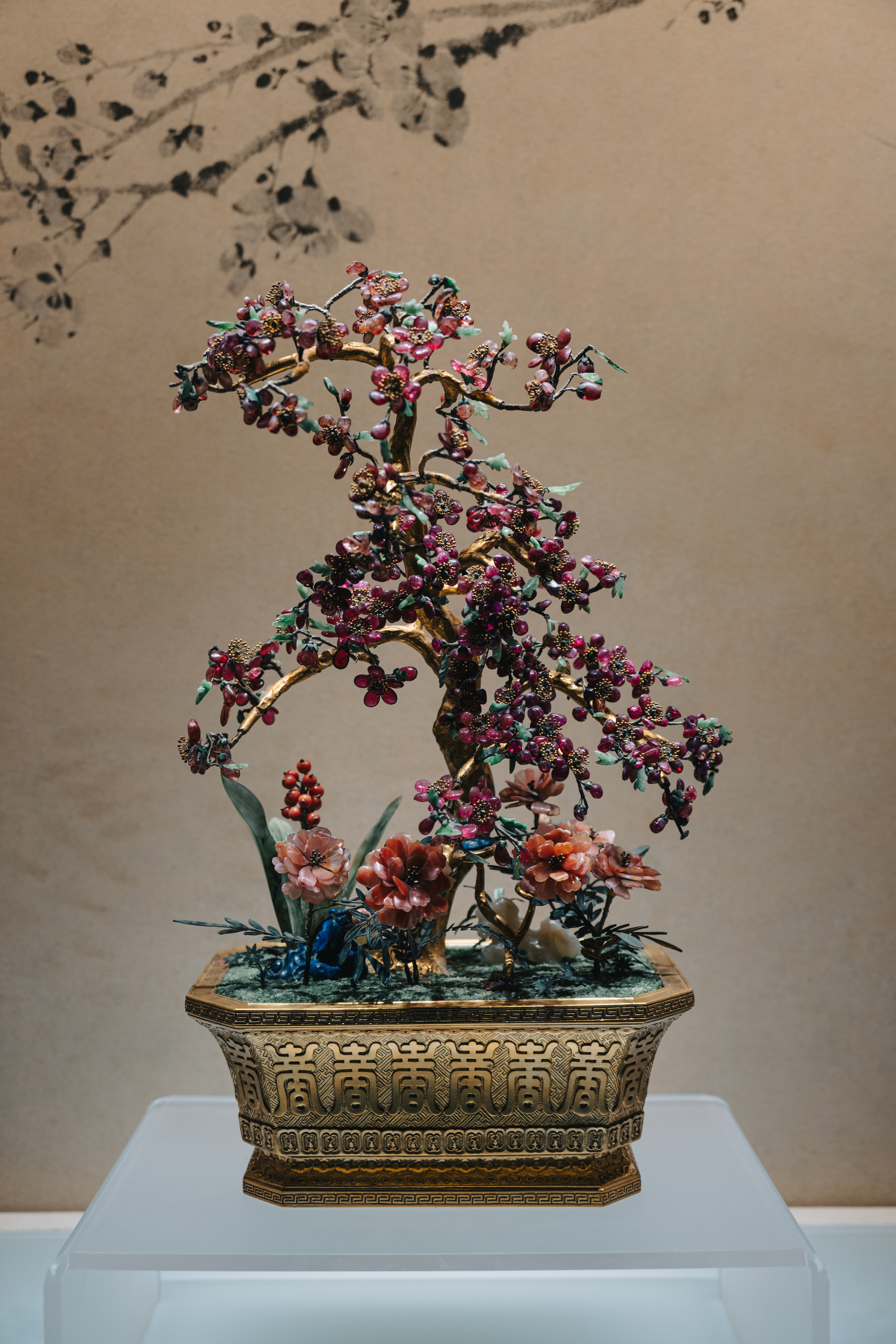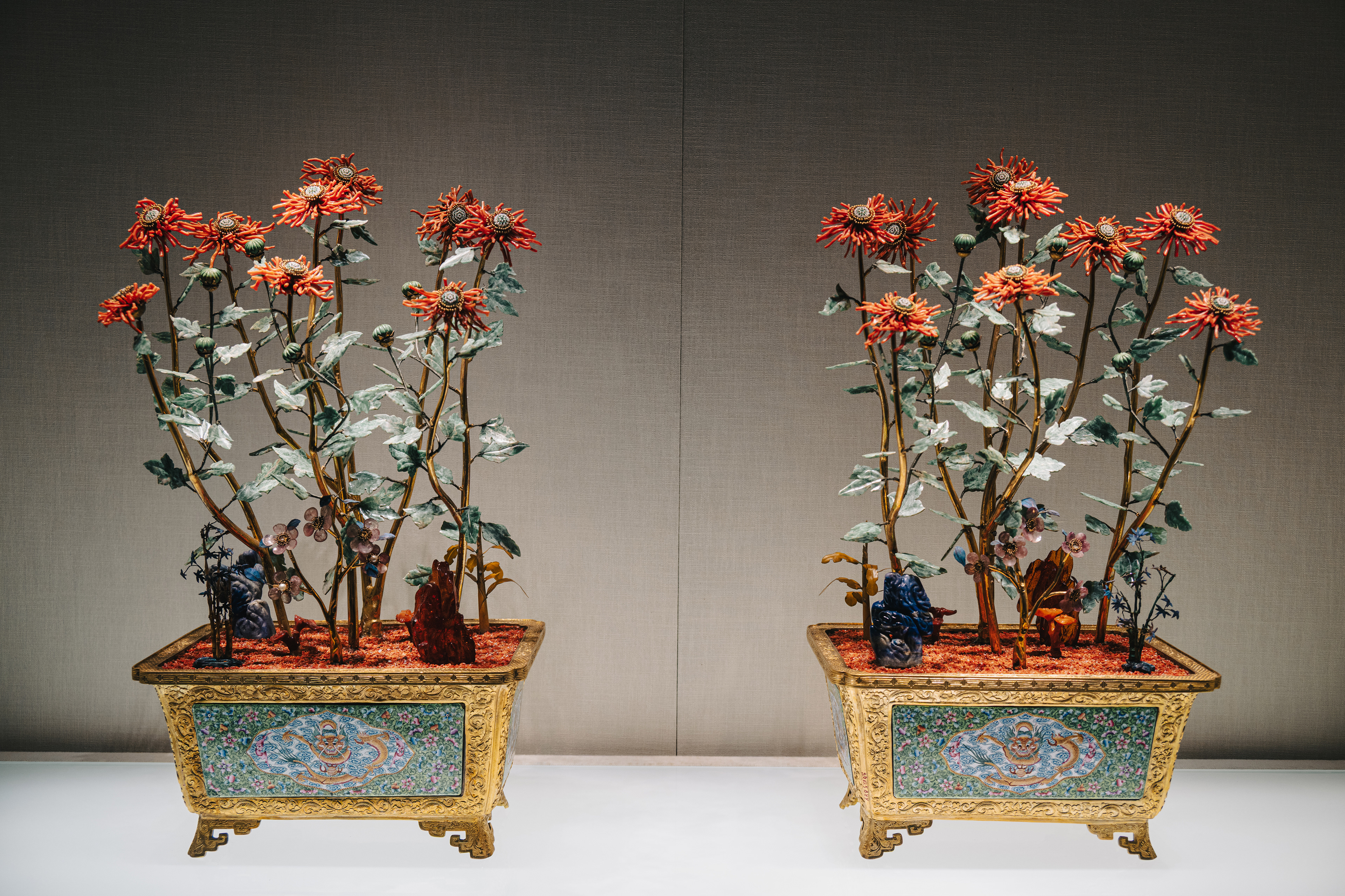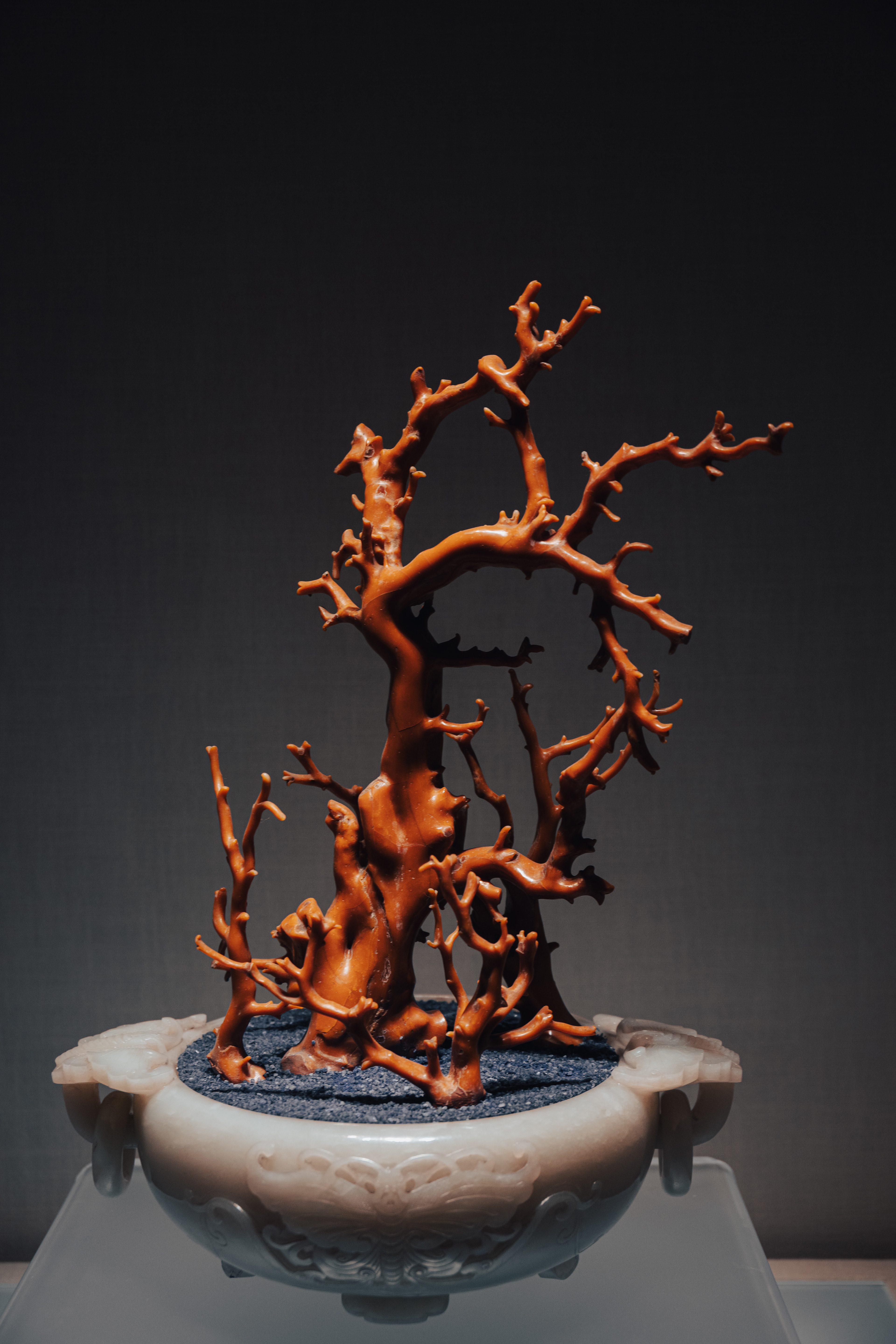 铜镀金嵌珐琅海棠式盆红珊瑚盆景