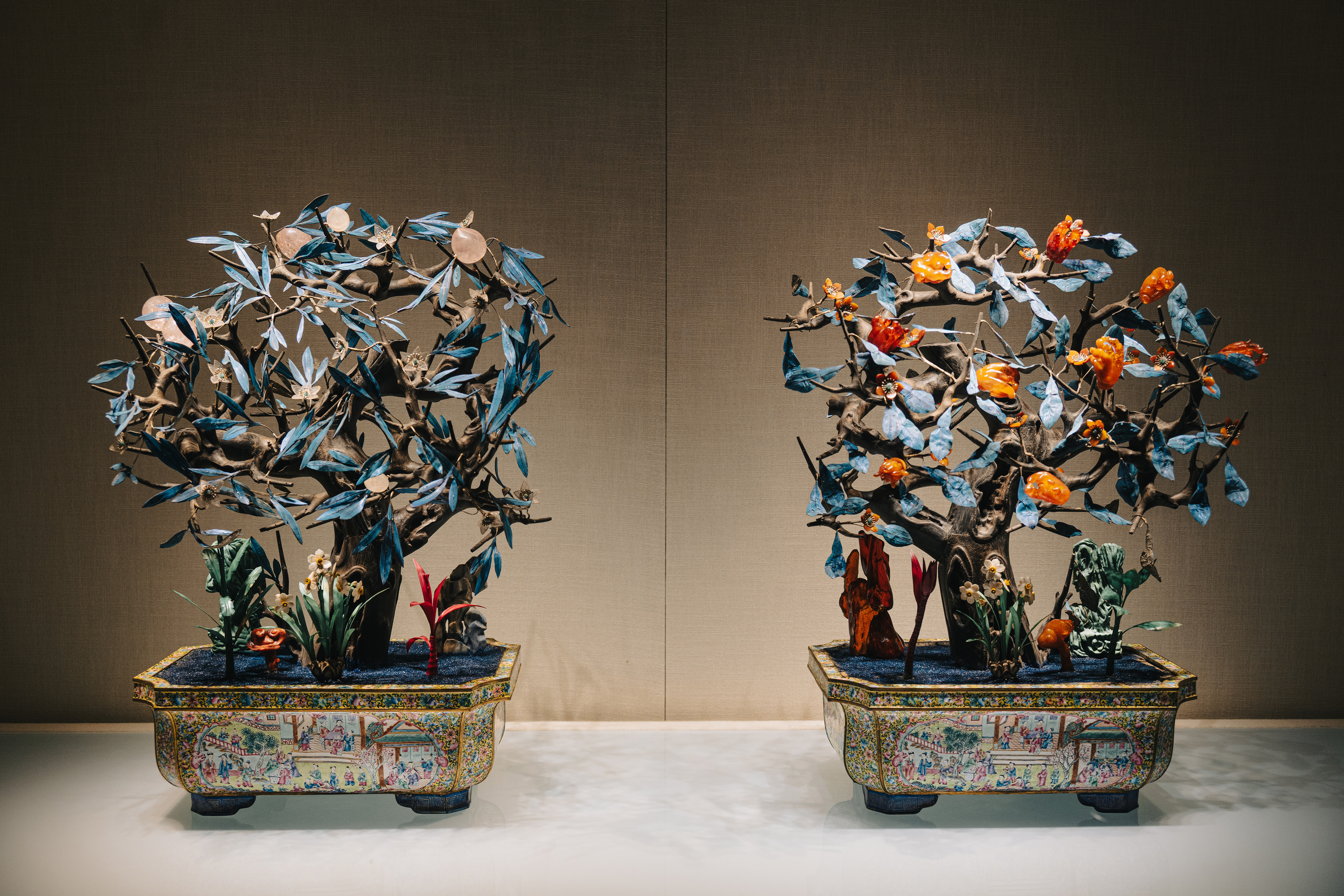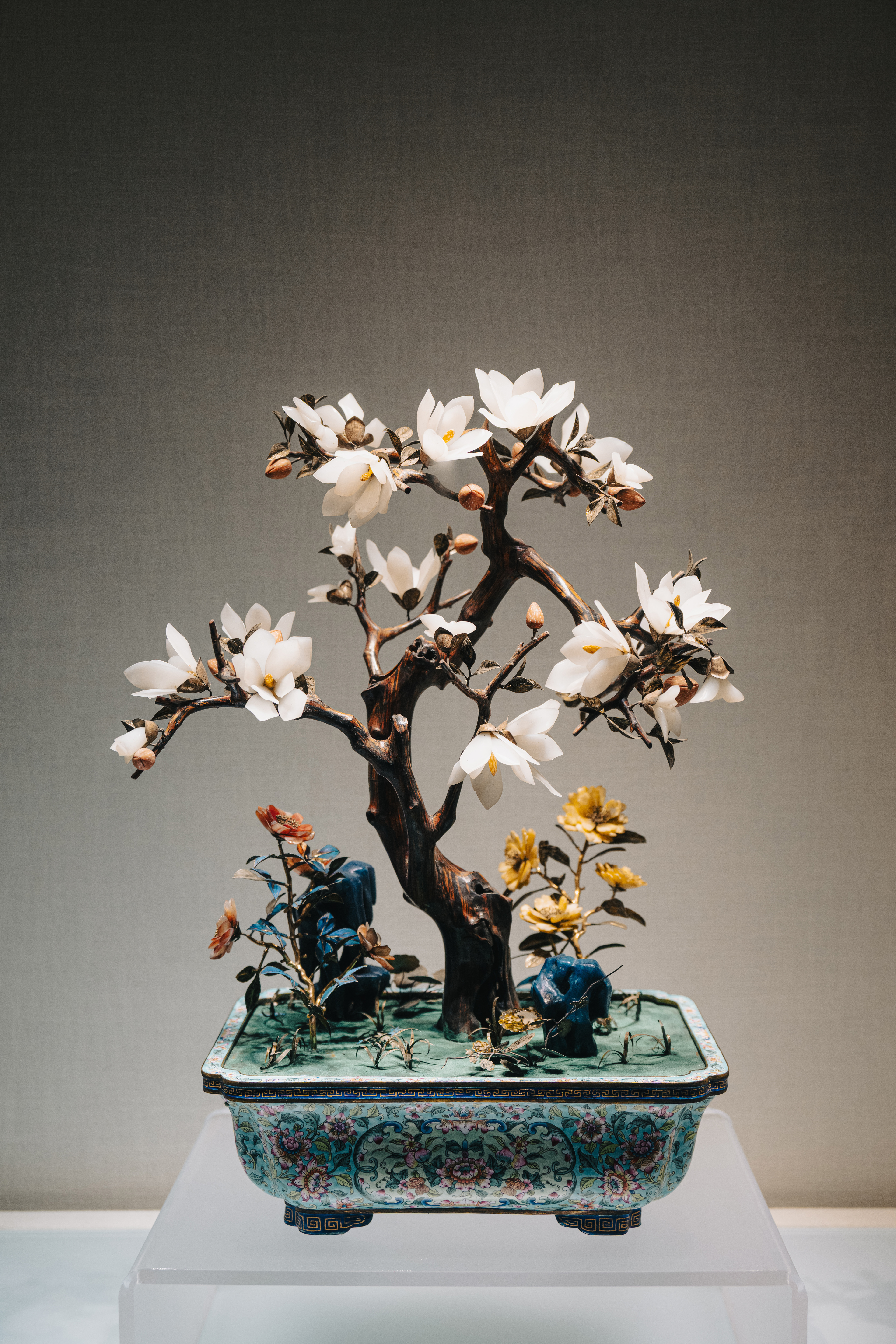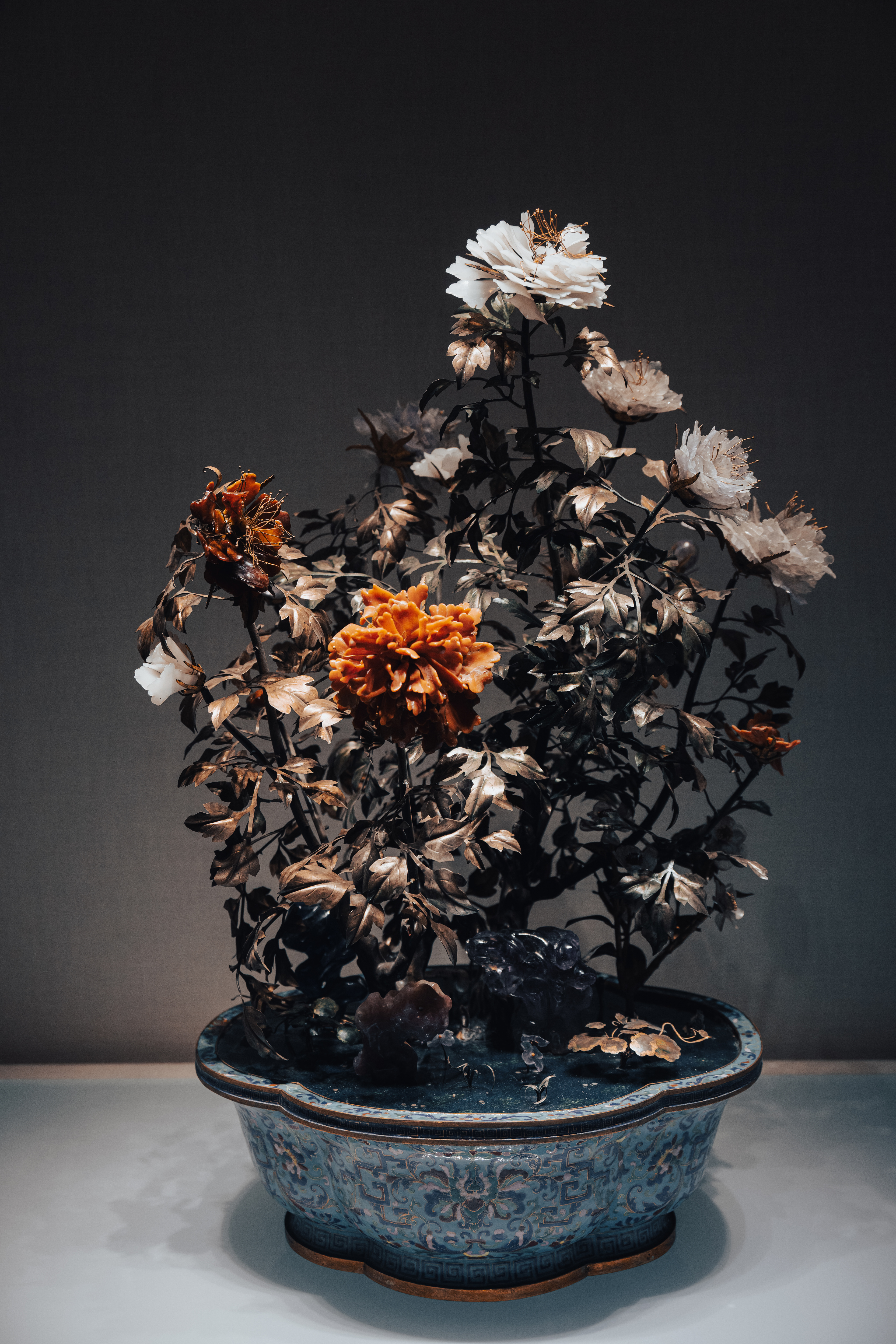 铜镀金嵌珐琅海棠式盆红珊瑚盆景