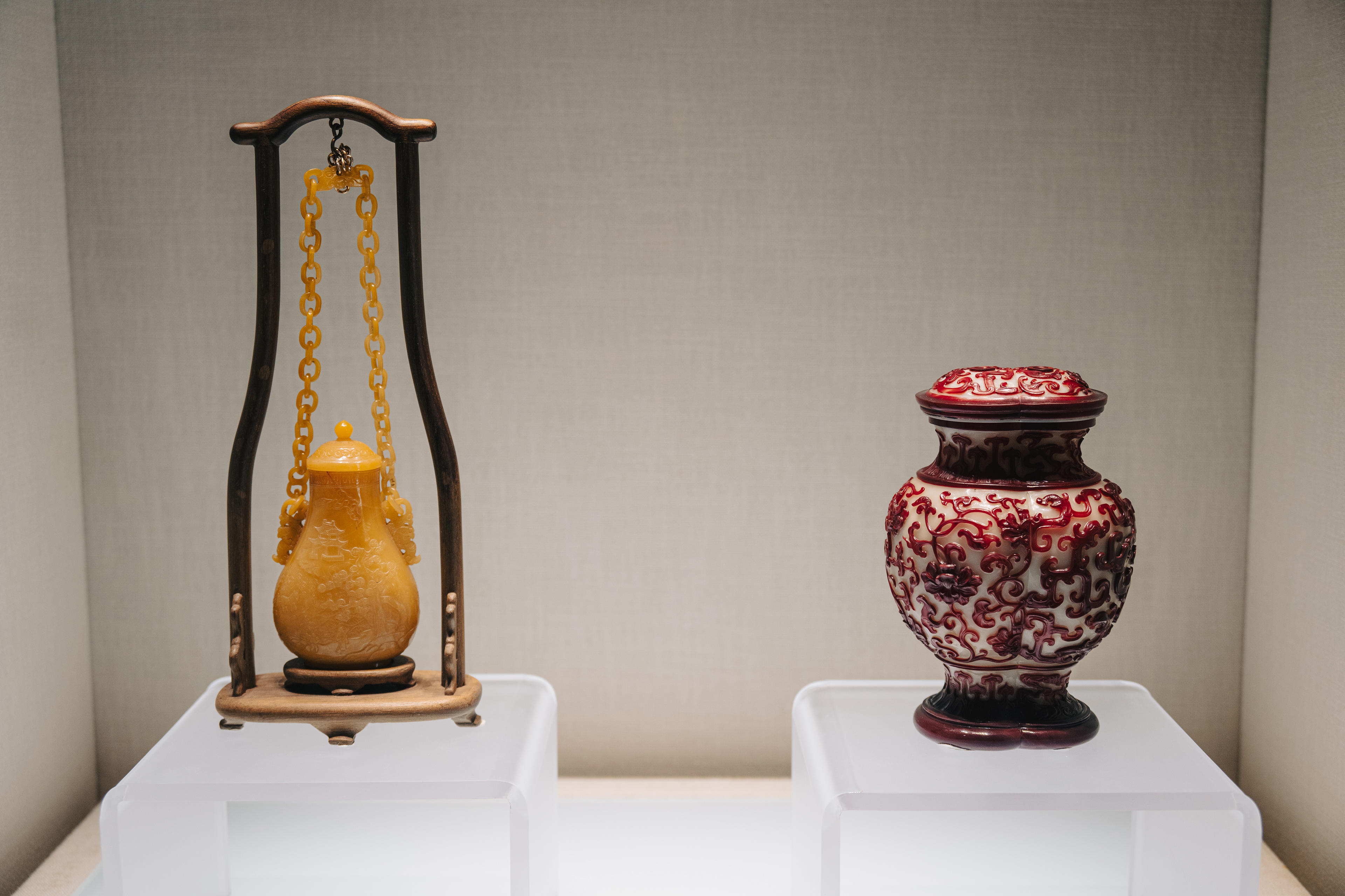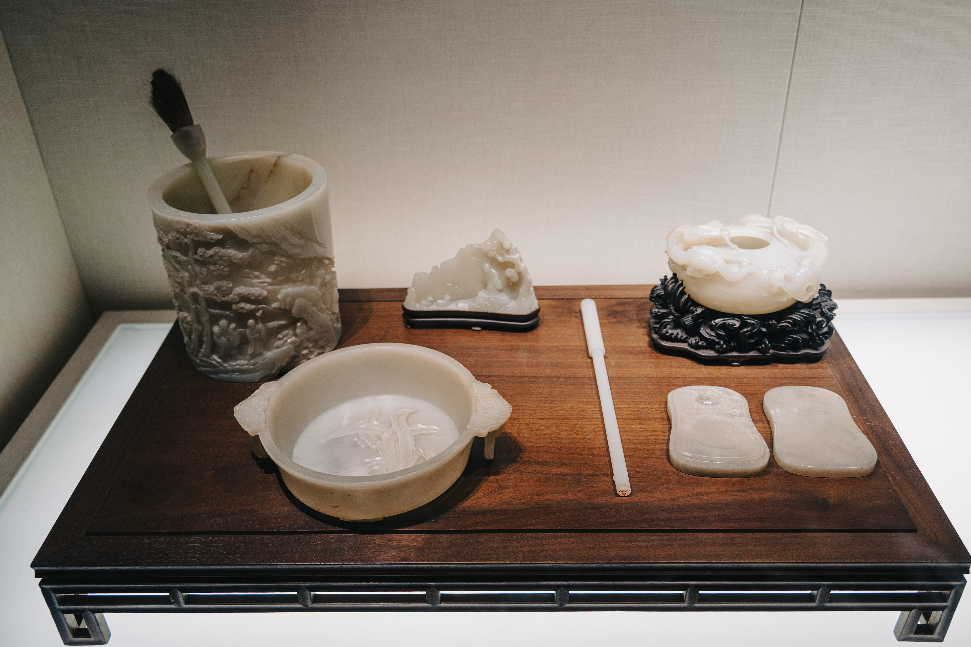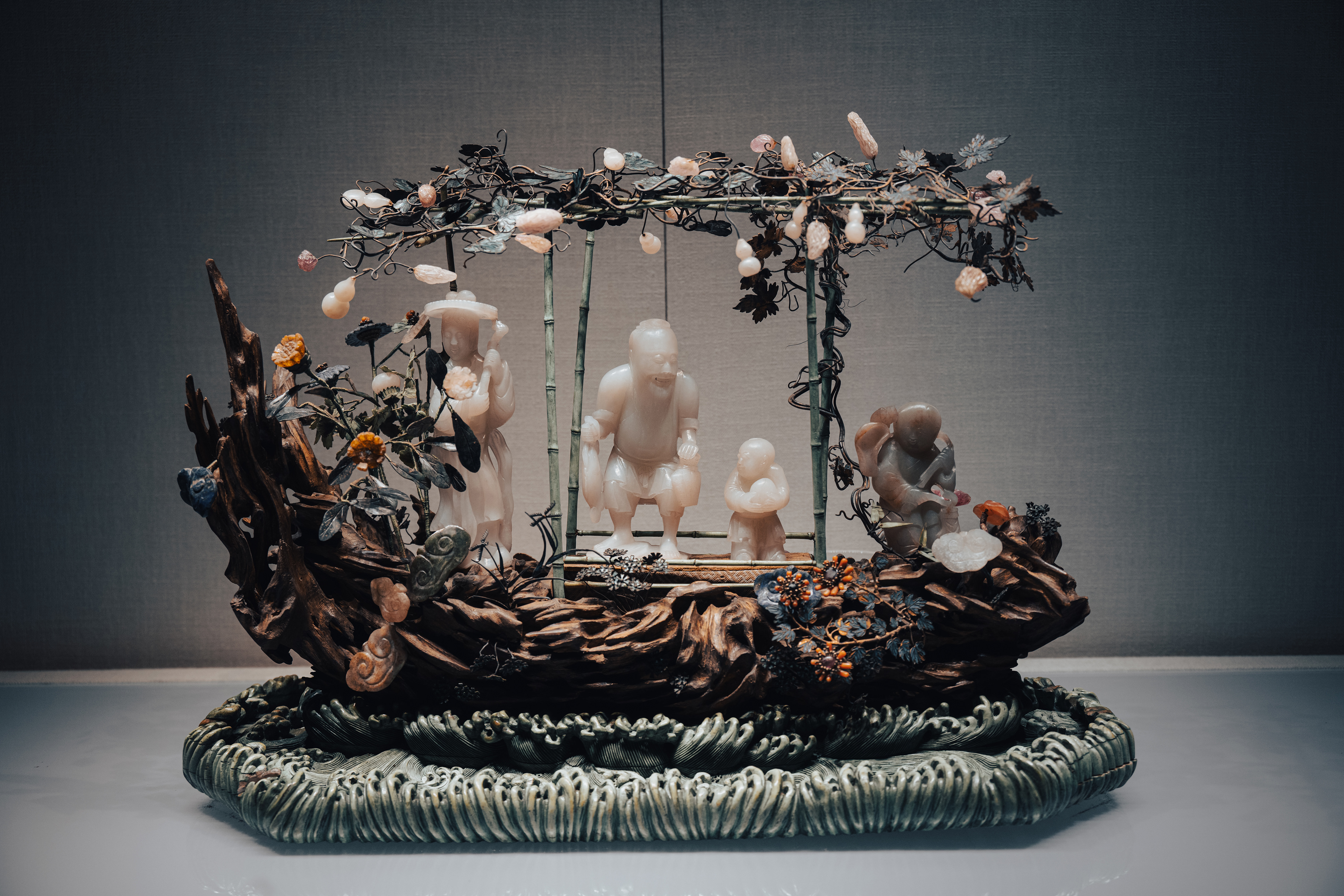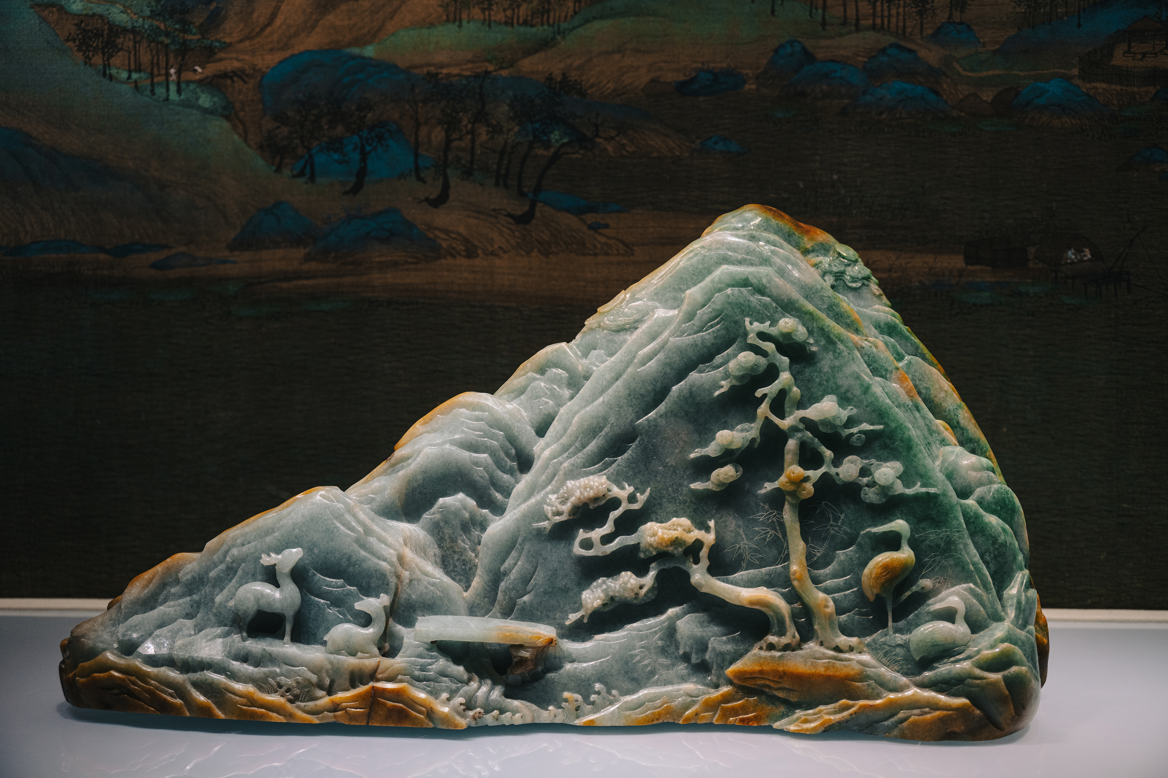 青金石雕山水图(左),松泉人物图(中),卧牛(右)