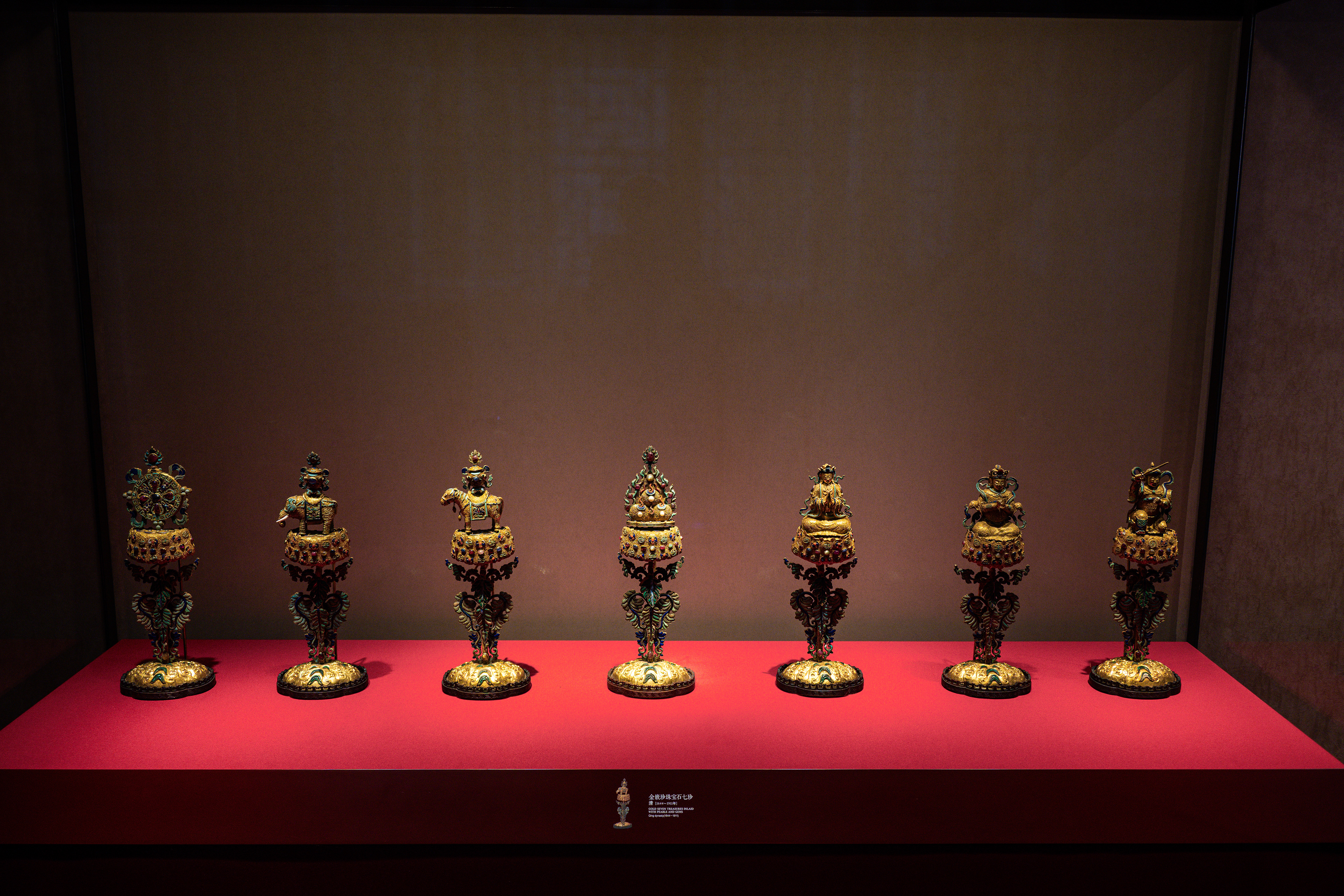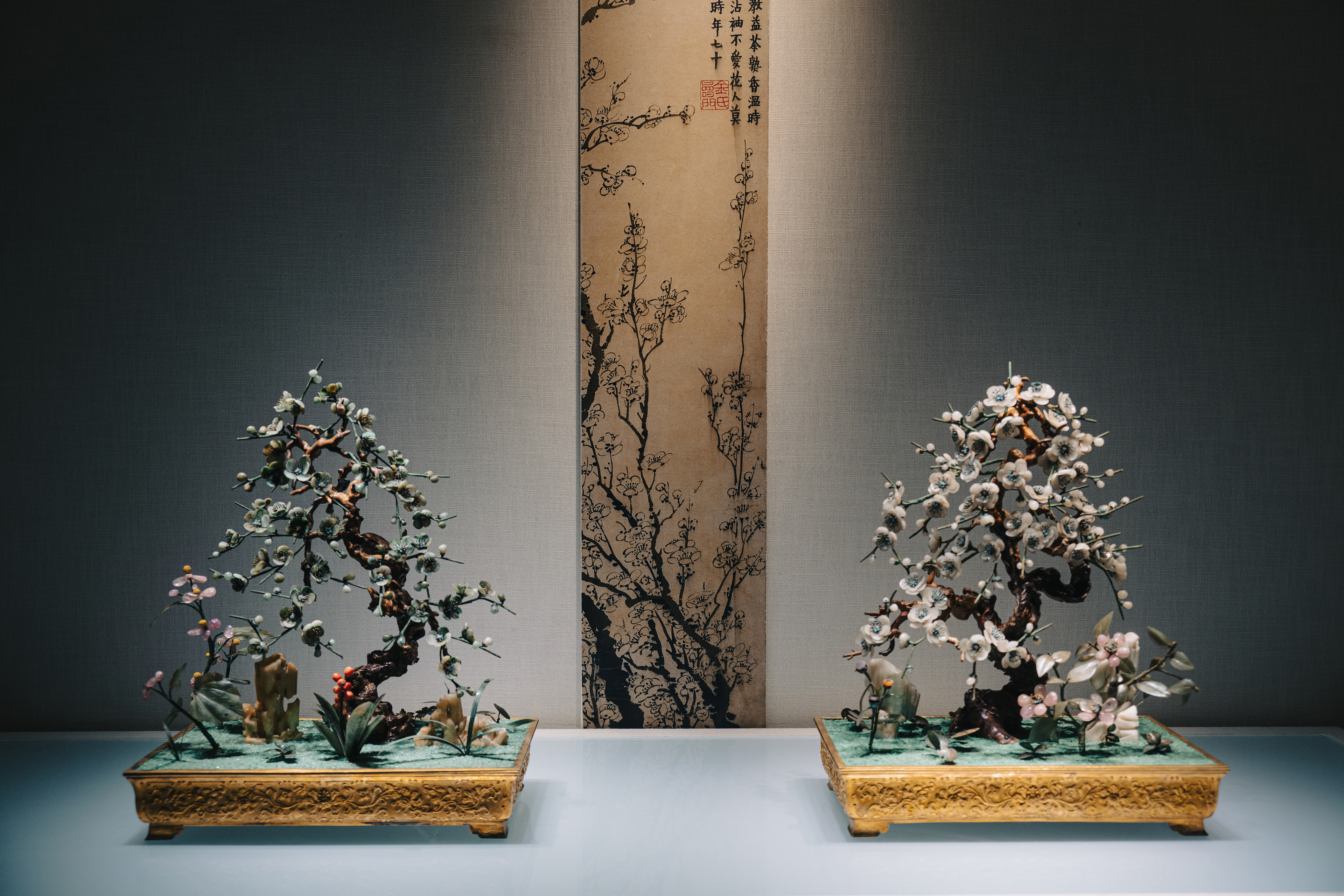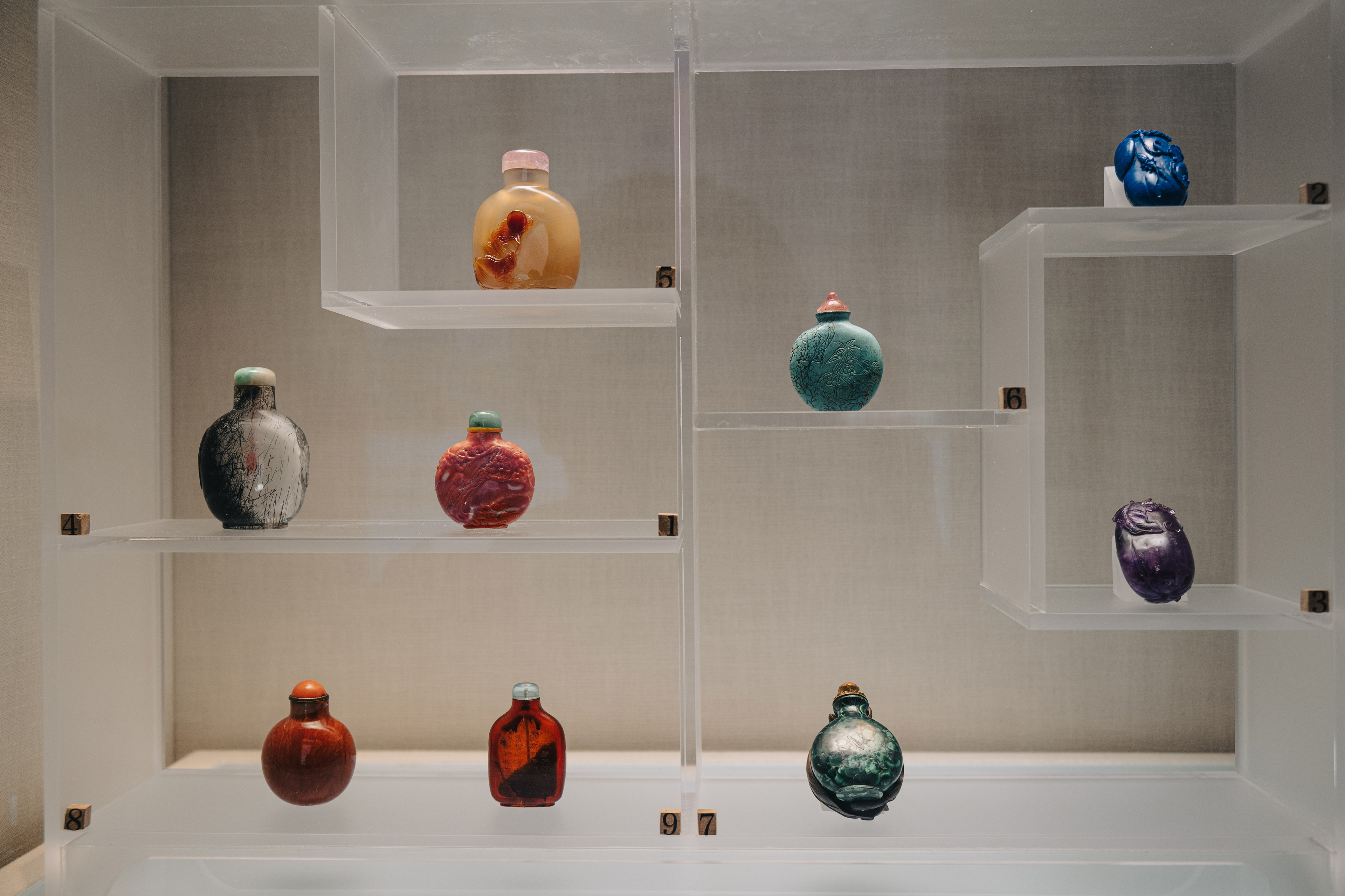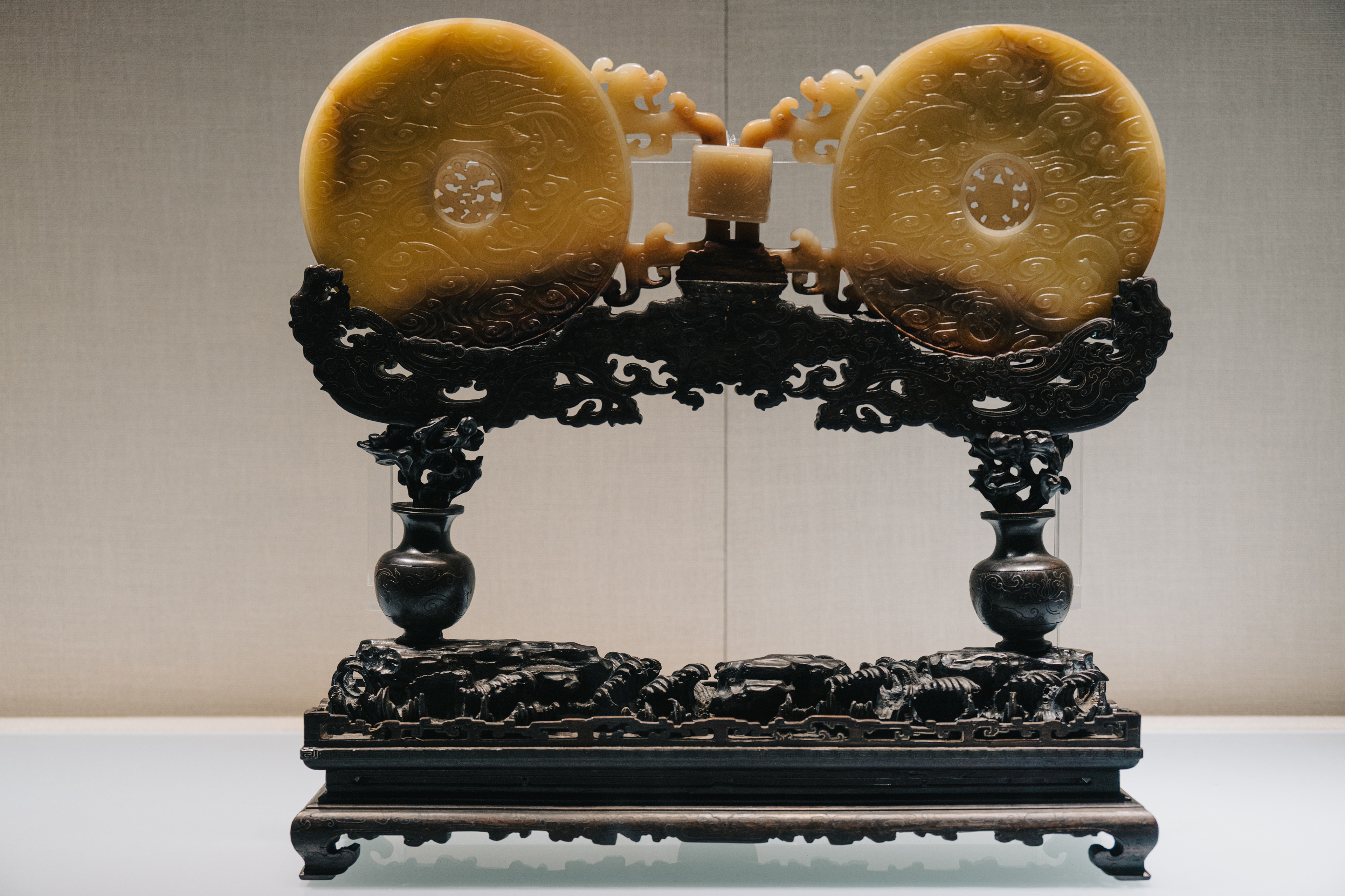 青金石雕山水图(左),松泉人物图(中),卧牛(右)