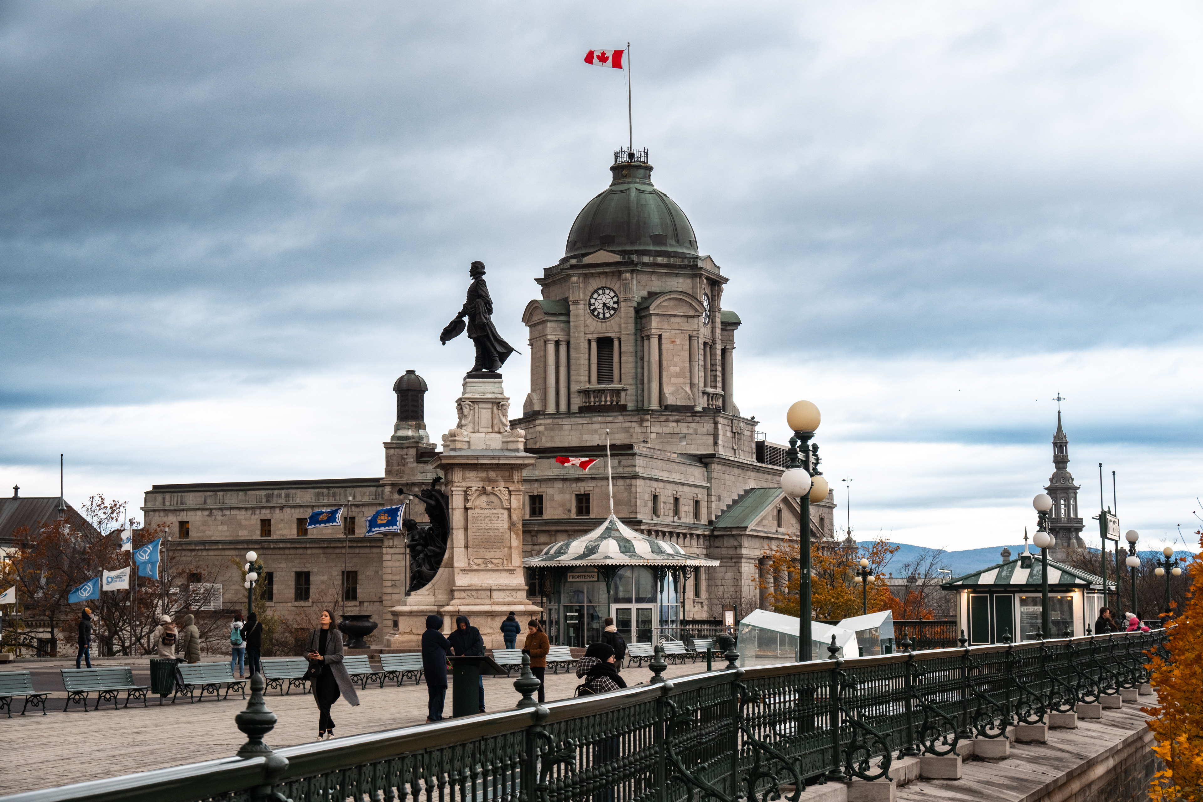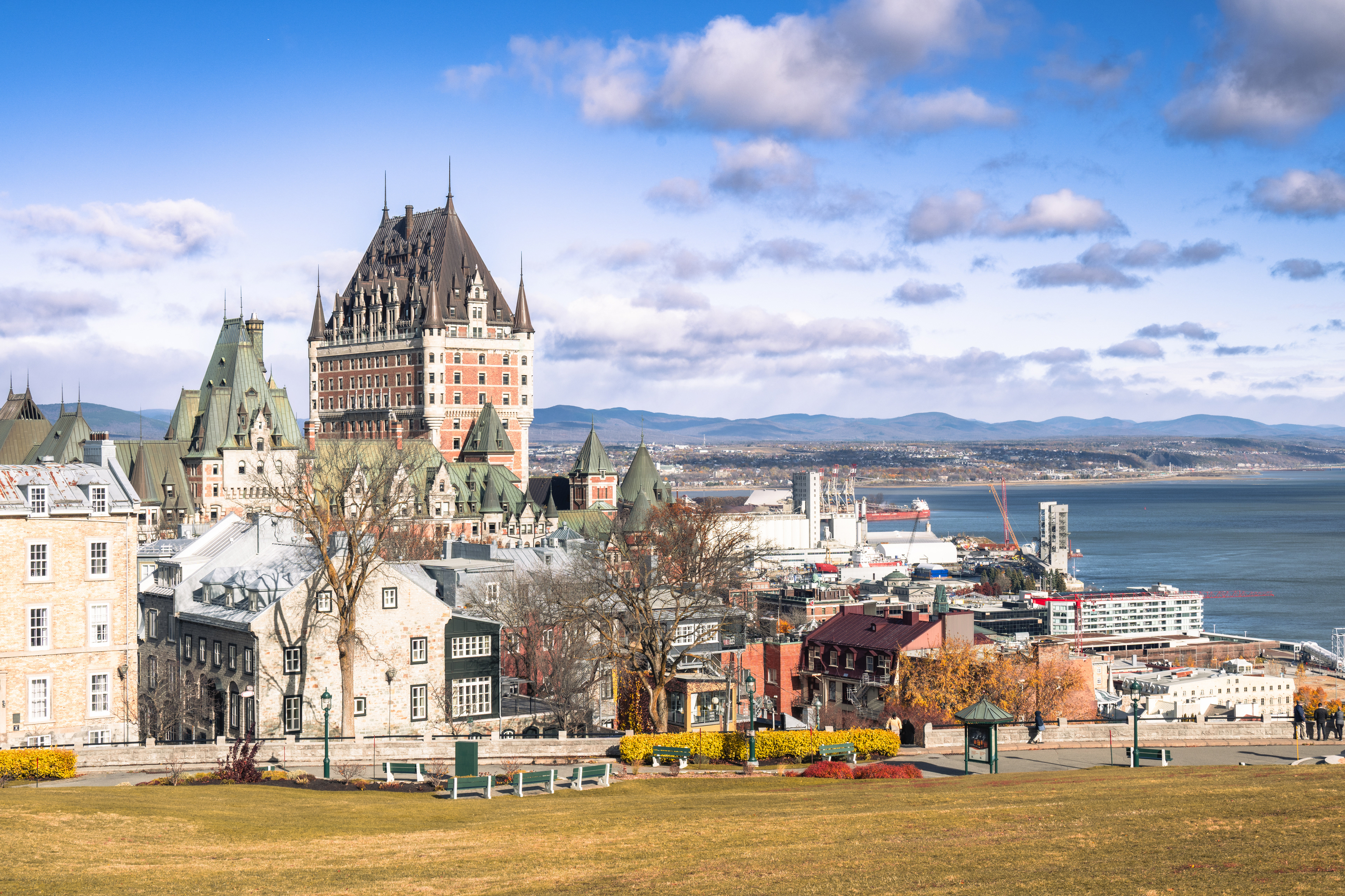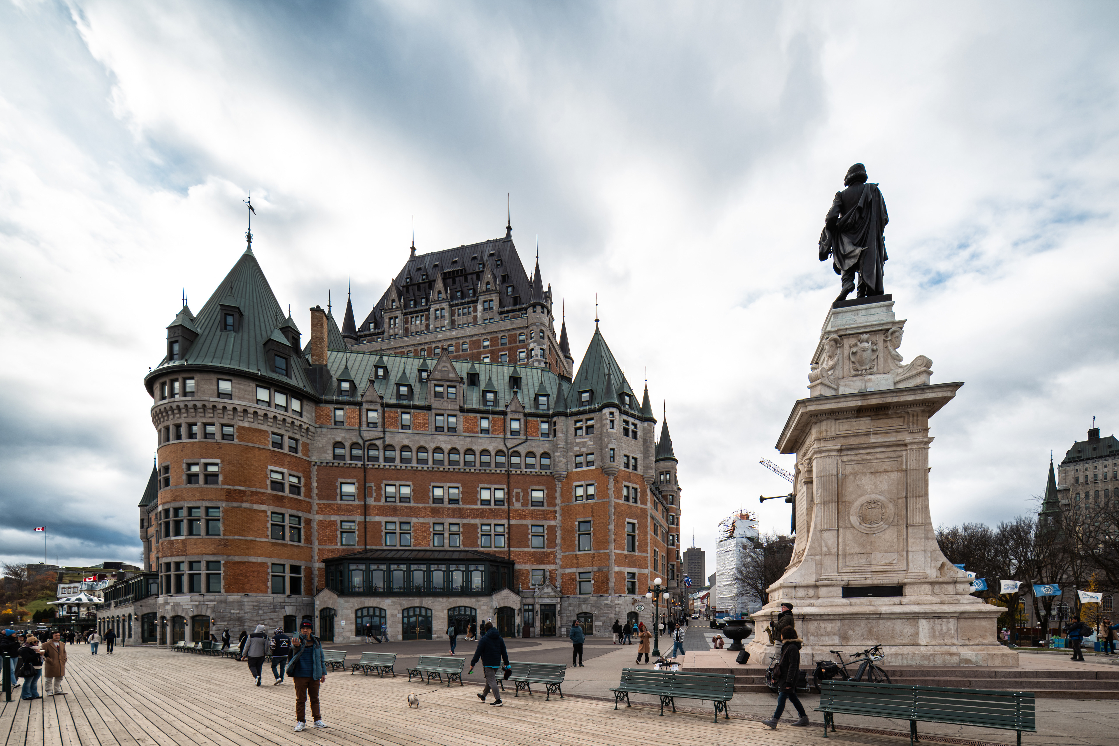 Dufferin Terrace, the long promenade that runs along the cliff edge between the Château Frontenac and the St. Lawrence far below, was designed in 1879 as a place for the Governor General to take the air. It remains the best vantage point in the city. The Château Frontenac itself — built by the Canadian Pacific Railway in 1893 and expanded continuously since — is allegedly the most photographed hotel in the world. It earns this by looking exactly like what a castle should look like, without actually being one.
