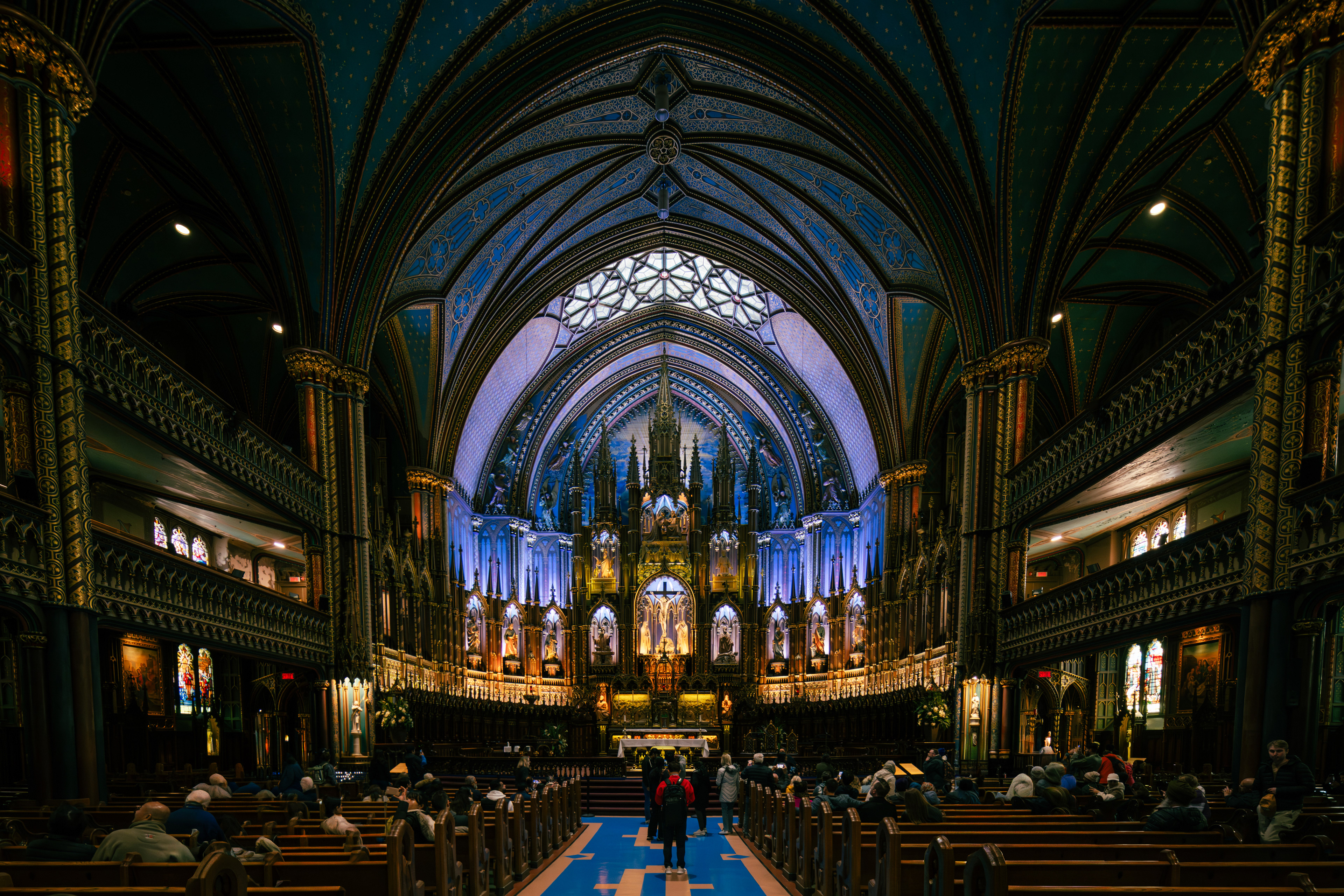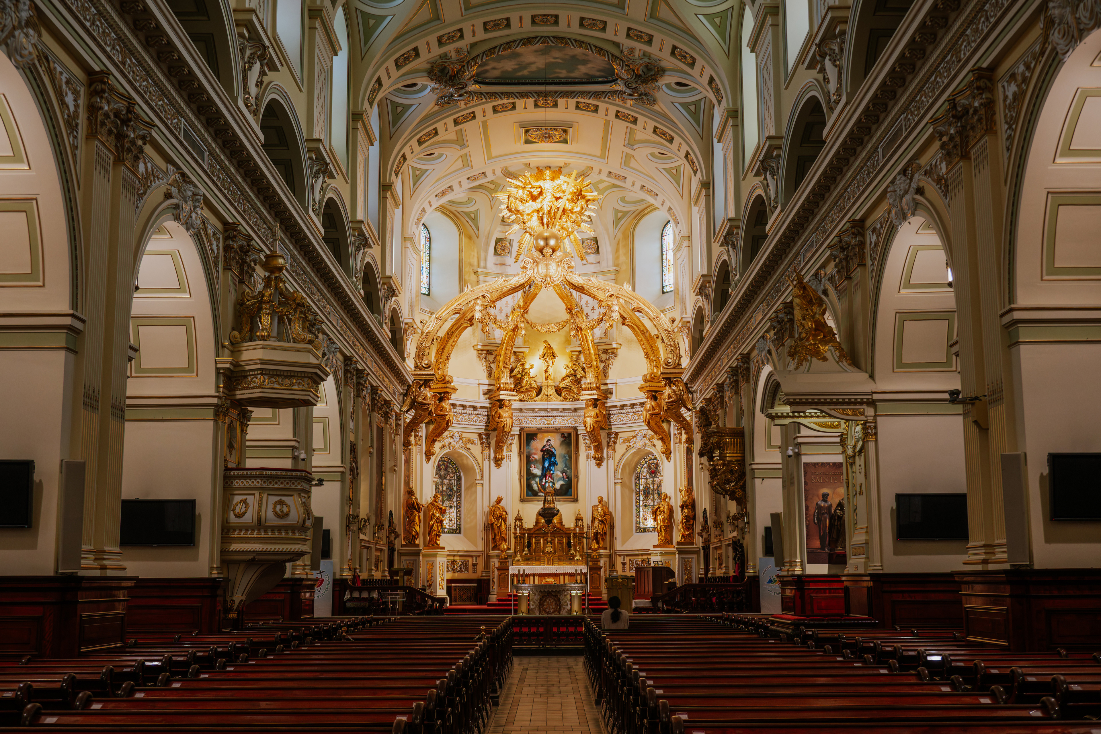 The second day in Québec City was for wandering. We started at the Basilique-cathédrale de Notre-Dame-de-Québec — the oldest parish church in North America, and the only one on the continent to hold a Holy Door, the kind that only swings open during Catholic Jubilee years as a symbol of pilgrimage and grace. The interior is all gilded wood and candlelight, the kind of Catholic opulence that took generations to accumulate and makes a point of it. Plaques line the walls marking the graves of bishops and governors-general buried beneath the floor, which gives the whole thing a very specific atmosphere: part cathedral, part archive, part reminder that this city has been here longer than most of the continent's capitals.