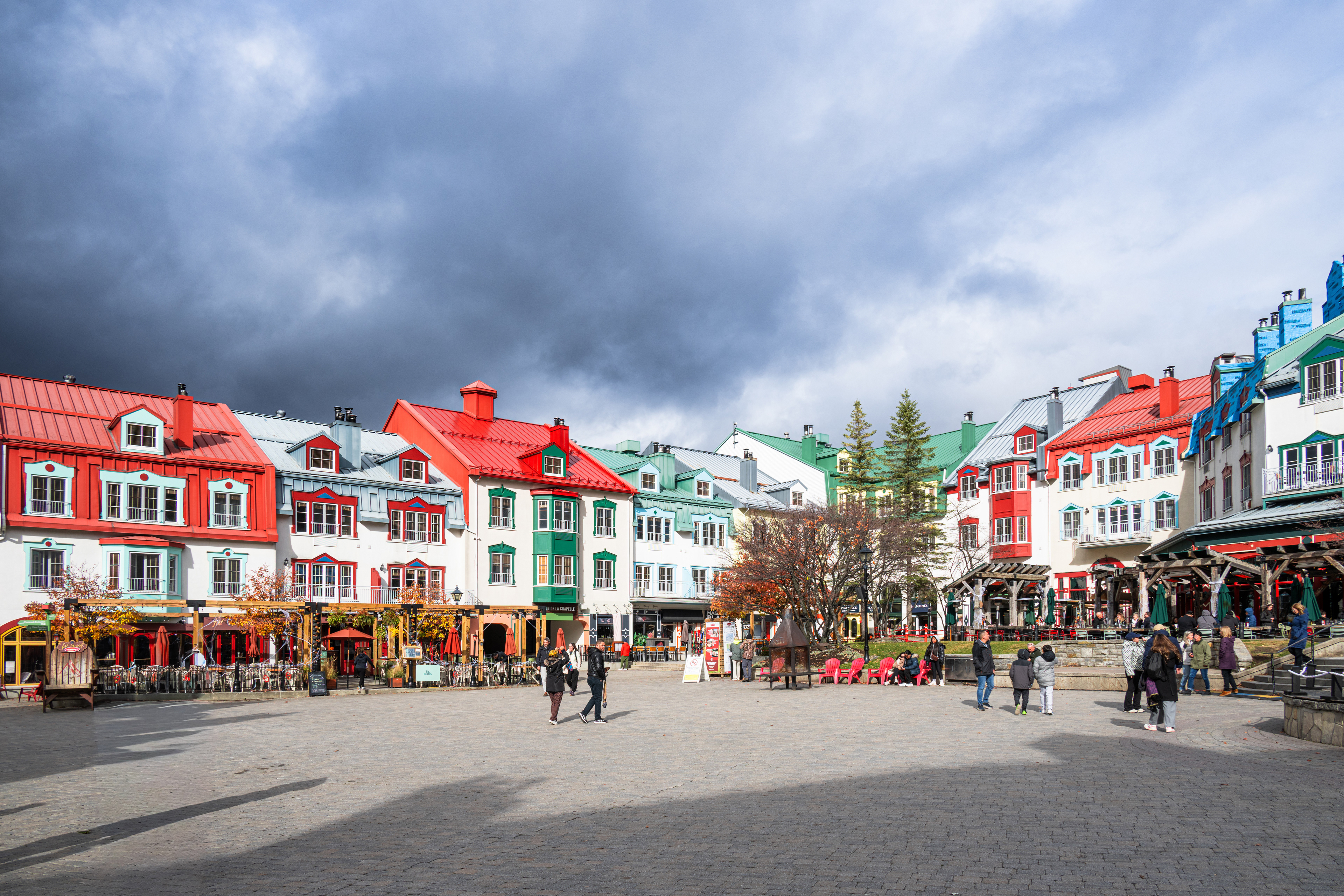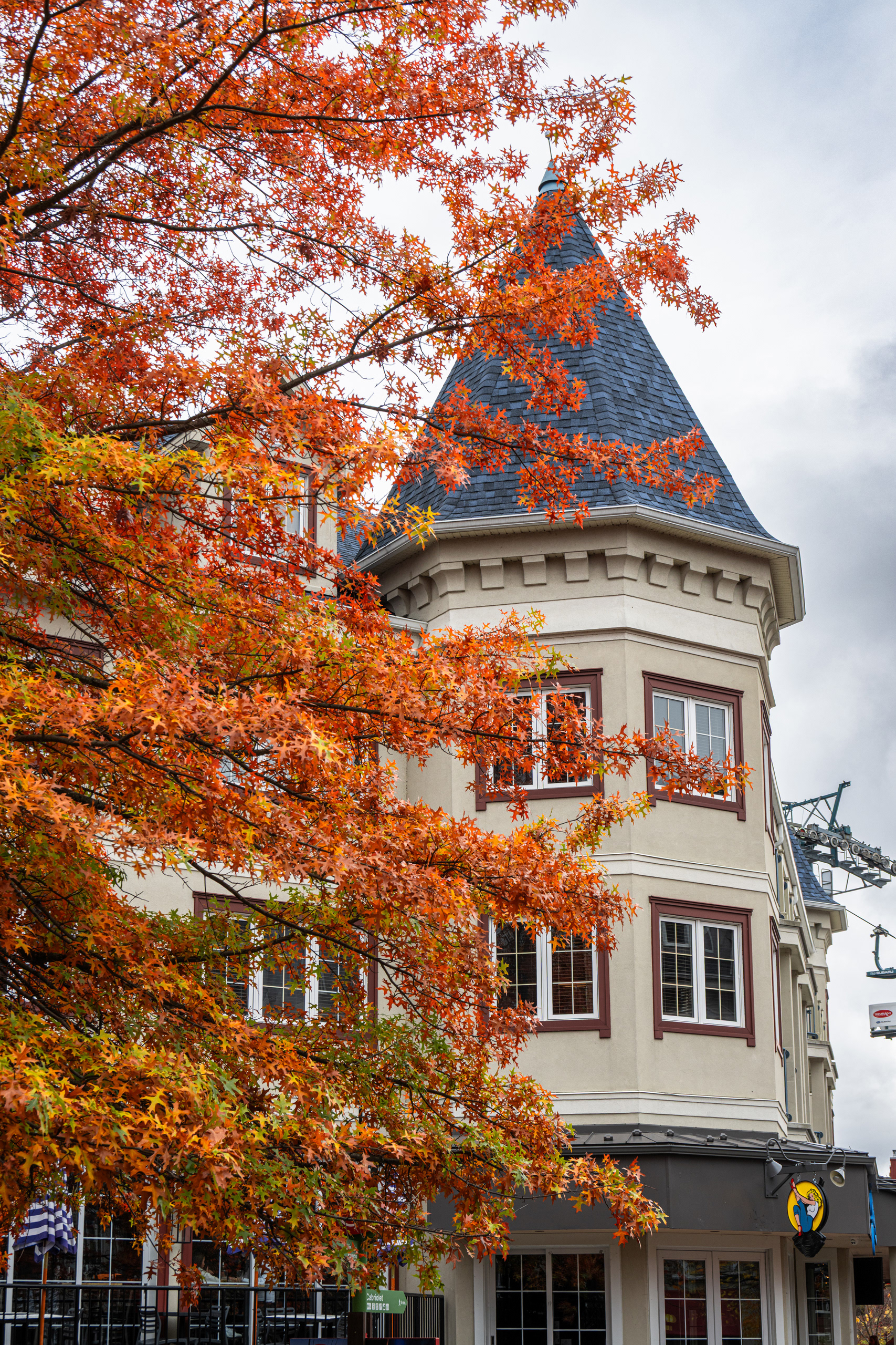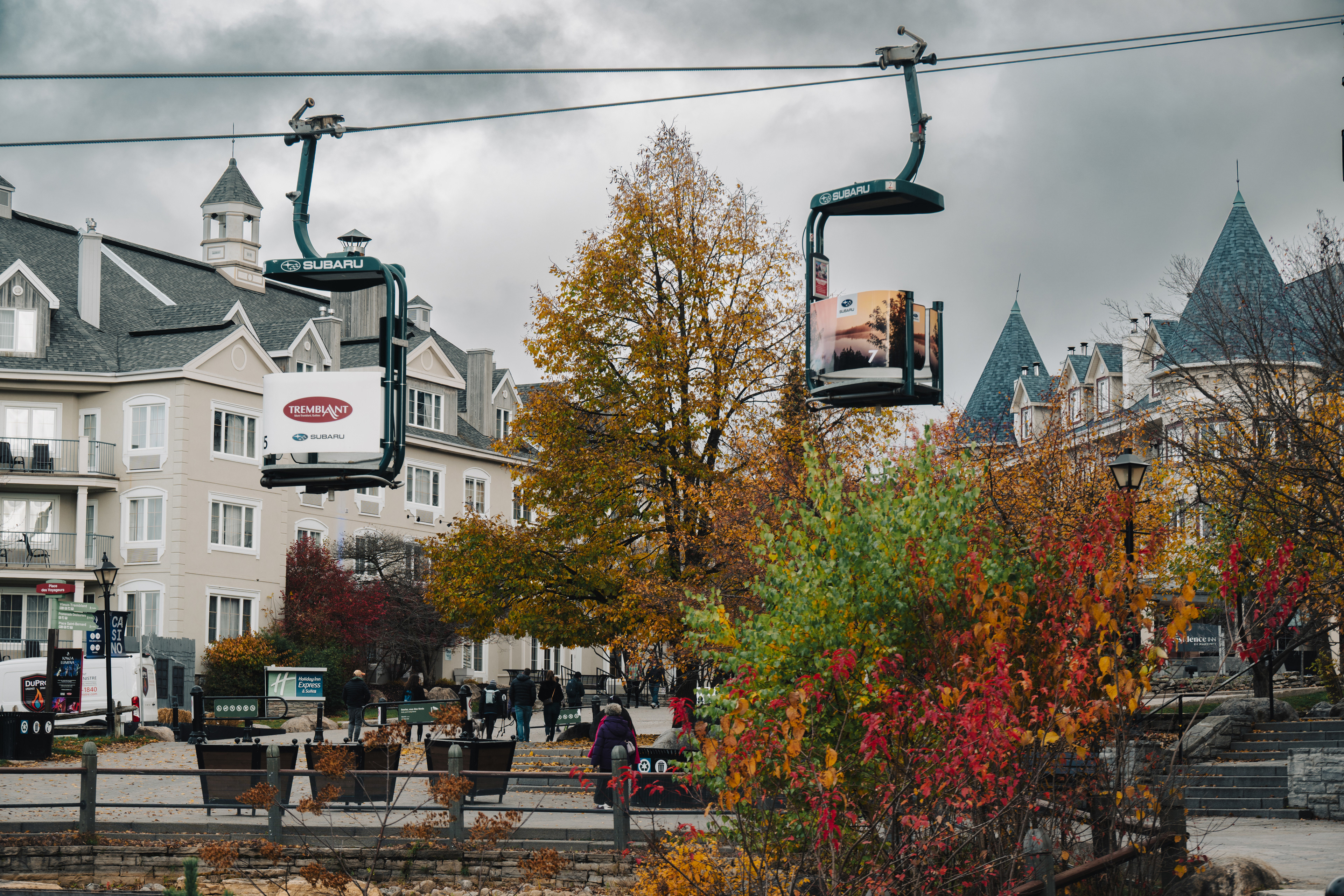 Mont-Tremblant village the next morning is the Disneyland version of a Québécois ski town — all cobblestones and pastel buildings and free gondola rides to the mid-mountain plaza — and there's nothing wrong with that. Toddlers and cable cars are a natural pairing. We rode it up and down twice because democracy sometimes means losing the vote on everything.