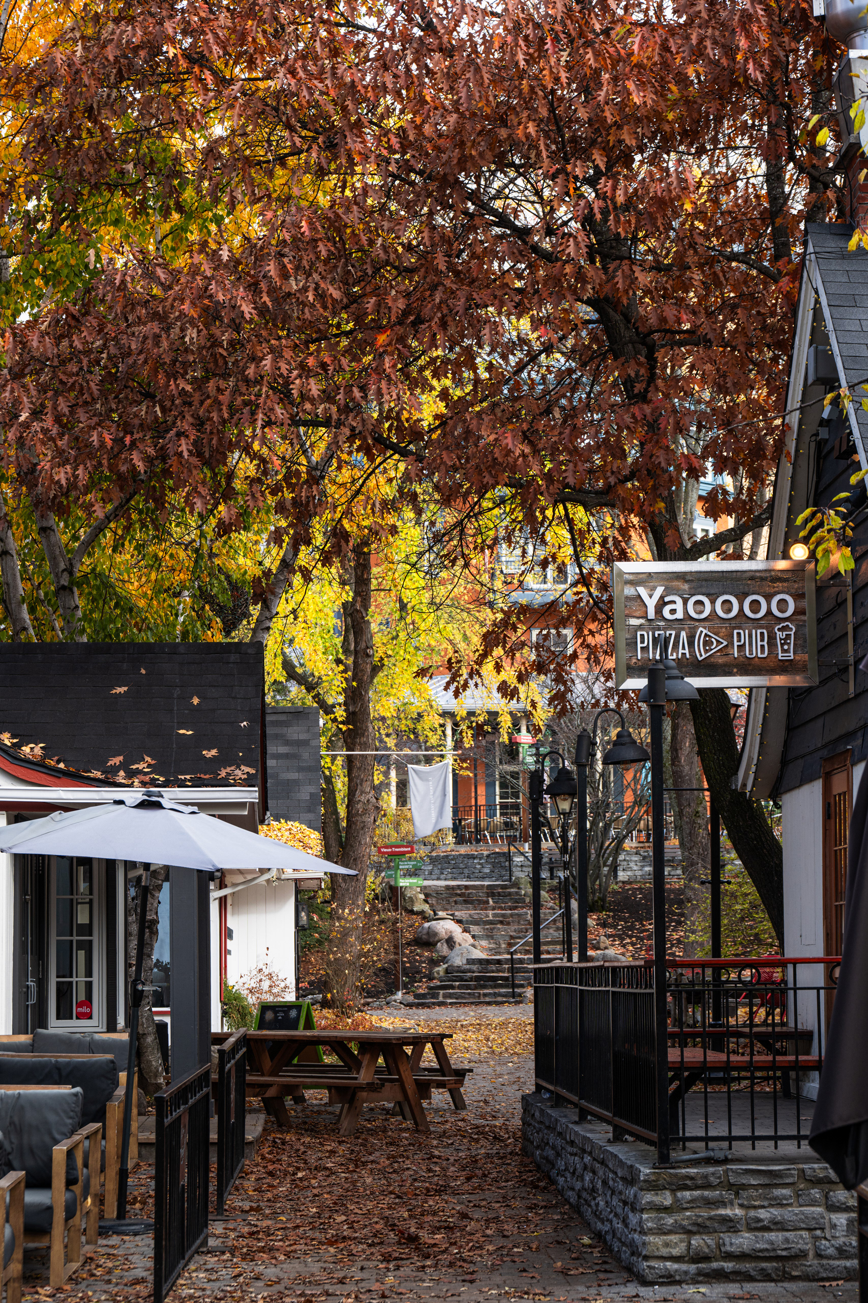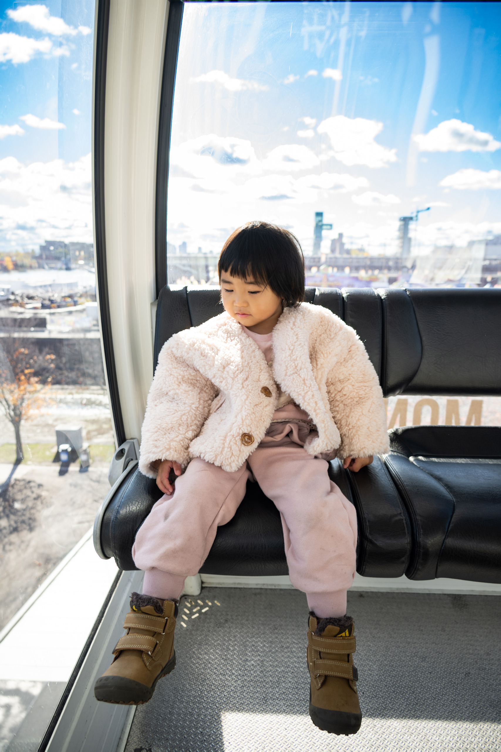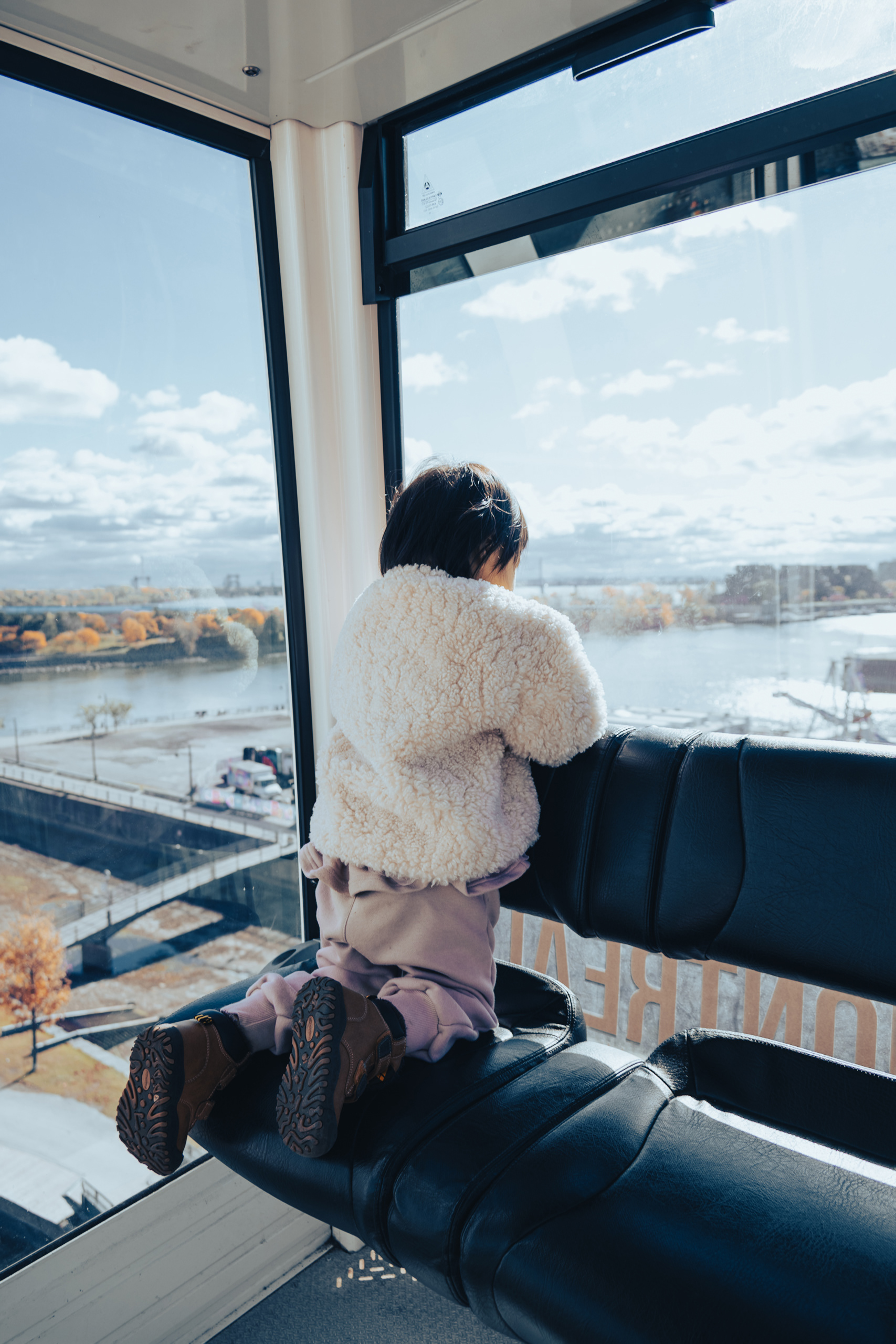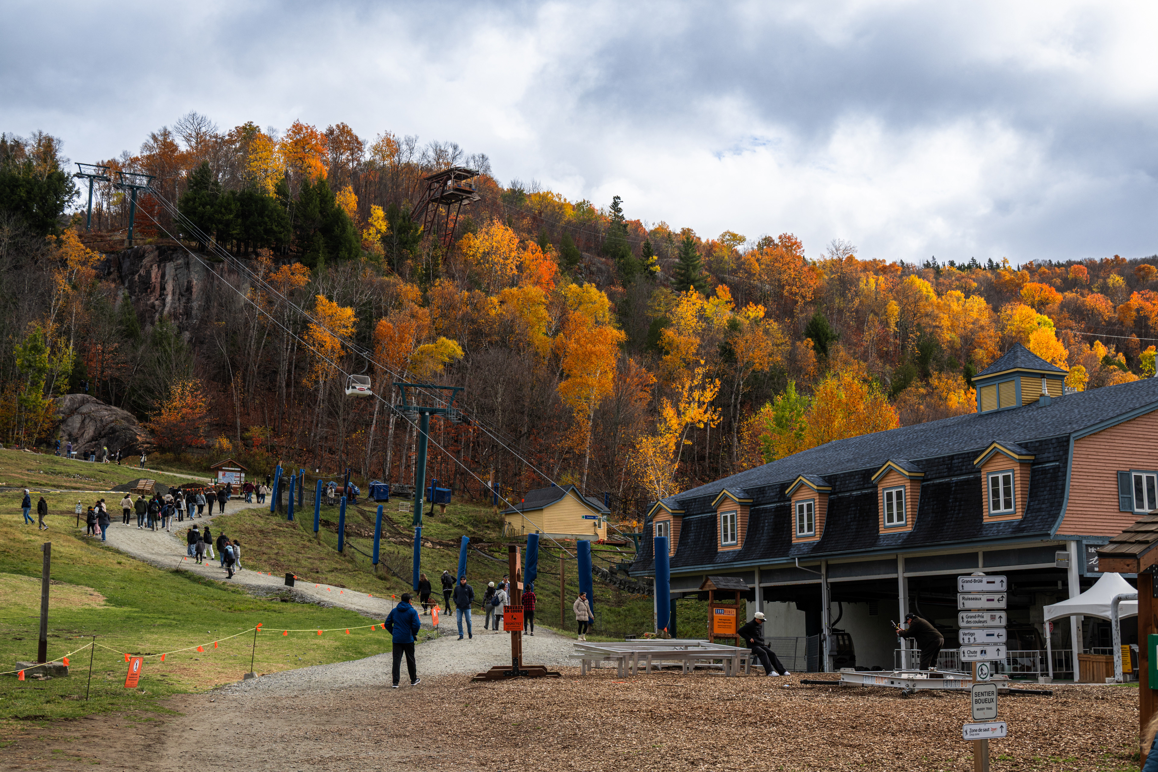 Mont-Tremblant village the next morning is the Disneyland version of a Québécois ski town — all cobblestones and pastel buildings and free gondola rides to the mid-mountain plaza — and there's nothing wrong with that. Toddlers and cable cars are a natural pairing. We rode it up and down twice because democracy sometimes means losing the vote on everything.