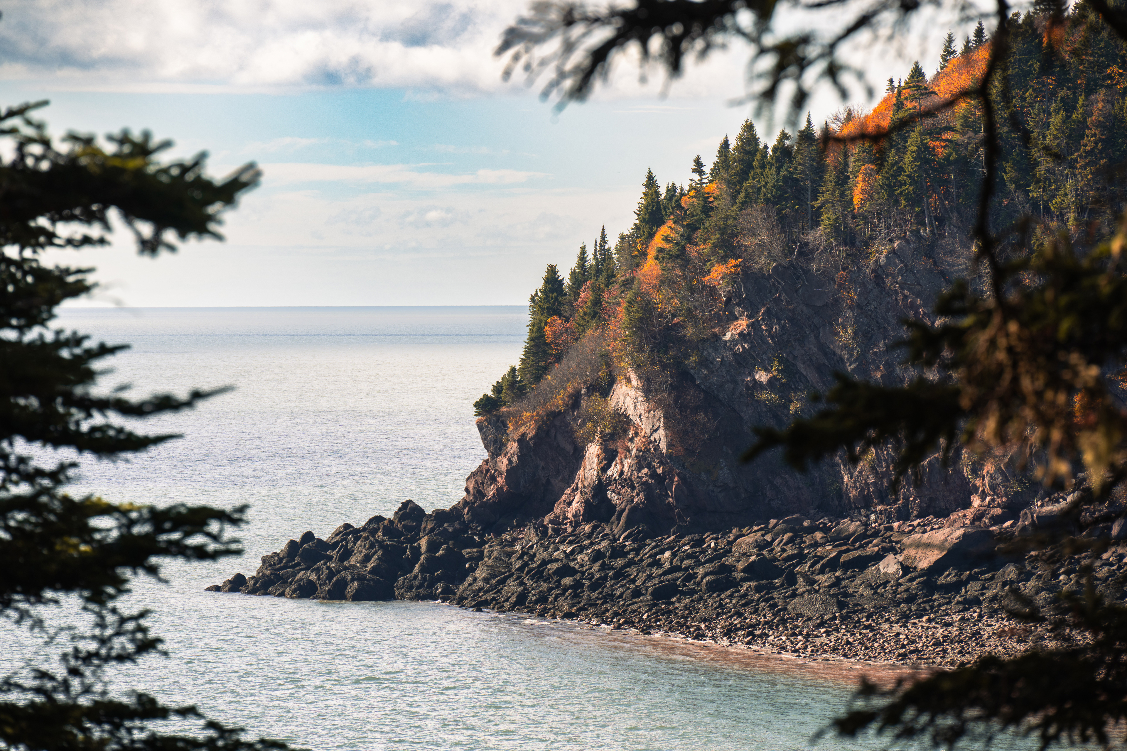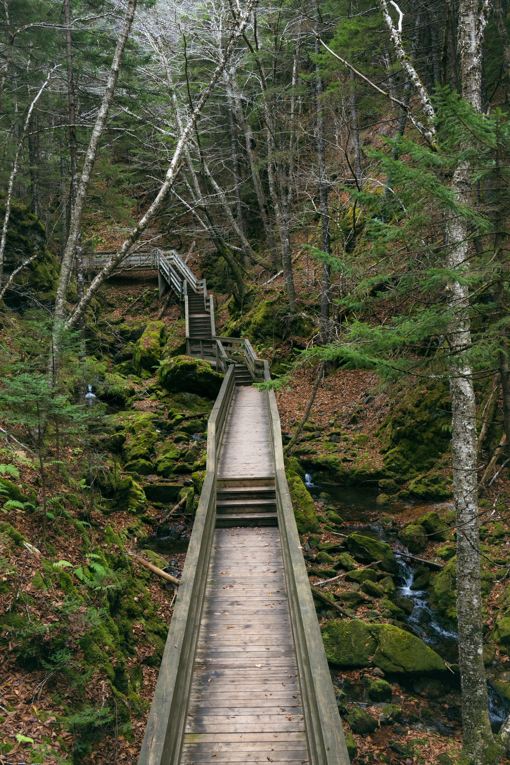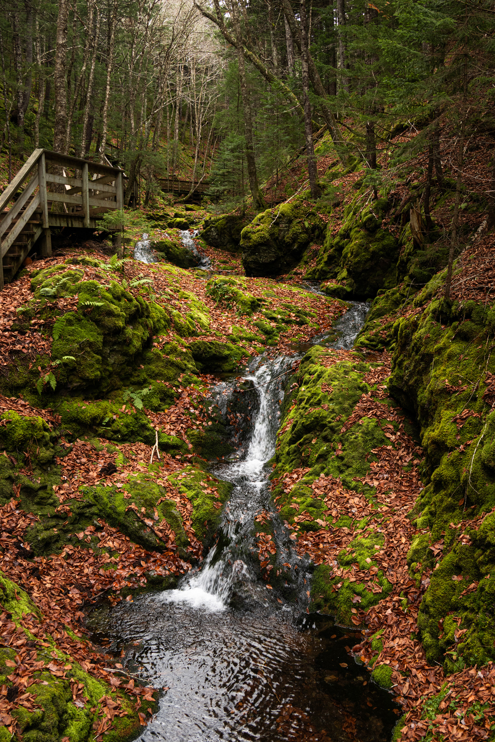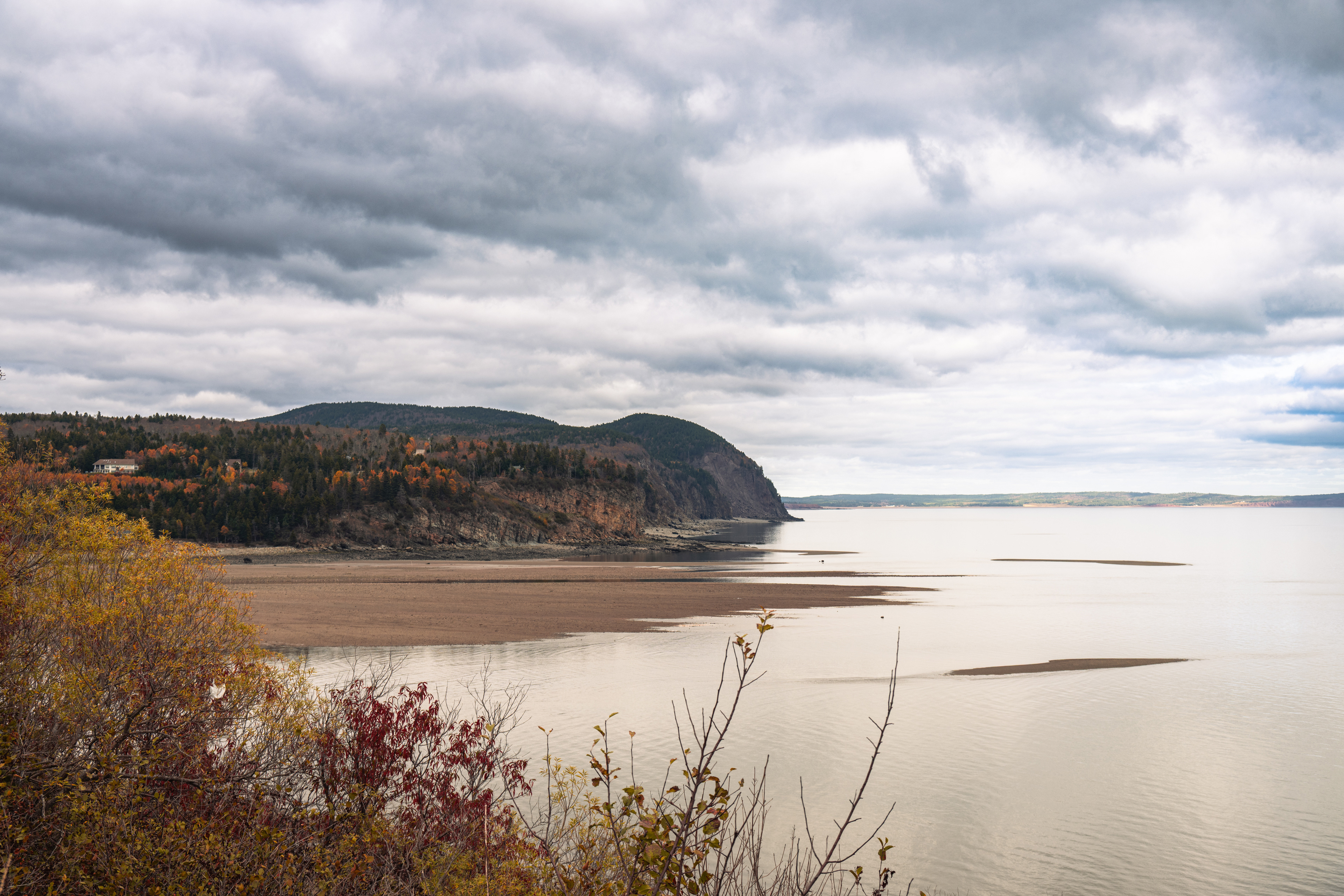 Then, Fundy National Park. The Matthew's Head Trail runs along the cliff edge above the bay, giving you the aerial view: the tidal flats exposed at low tide, stretching hundreds of meters out from the base of the red sandstone cliffs, scored by tidal channels that look from above like the drainage patterns of a river delta in miniature. Dickson Falls, tucked into the forest interior, is the quieter counterpoint — a cascading series of drops over carved rock, shaded by old-growth hemlock, dripping with moss.