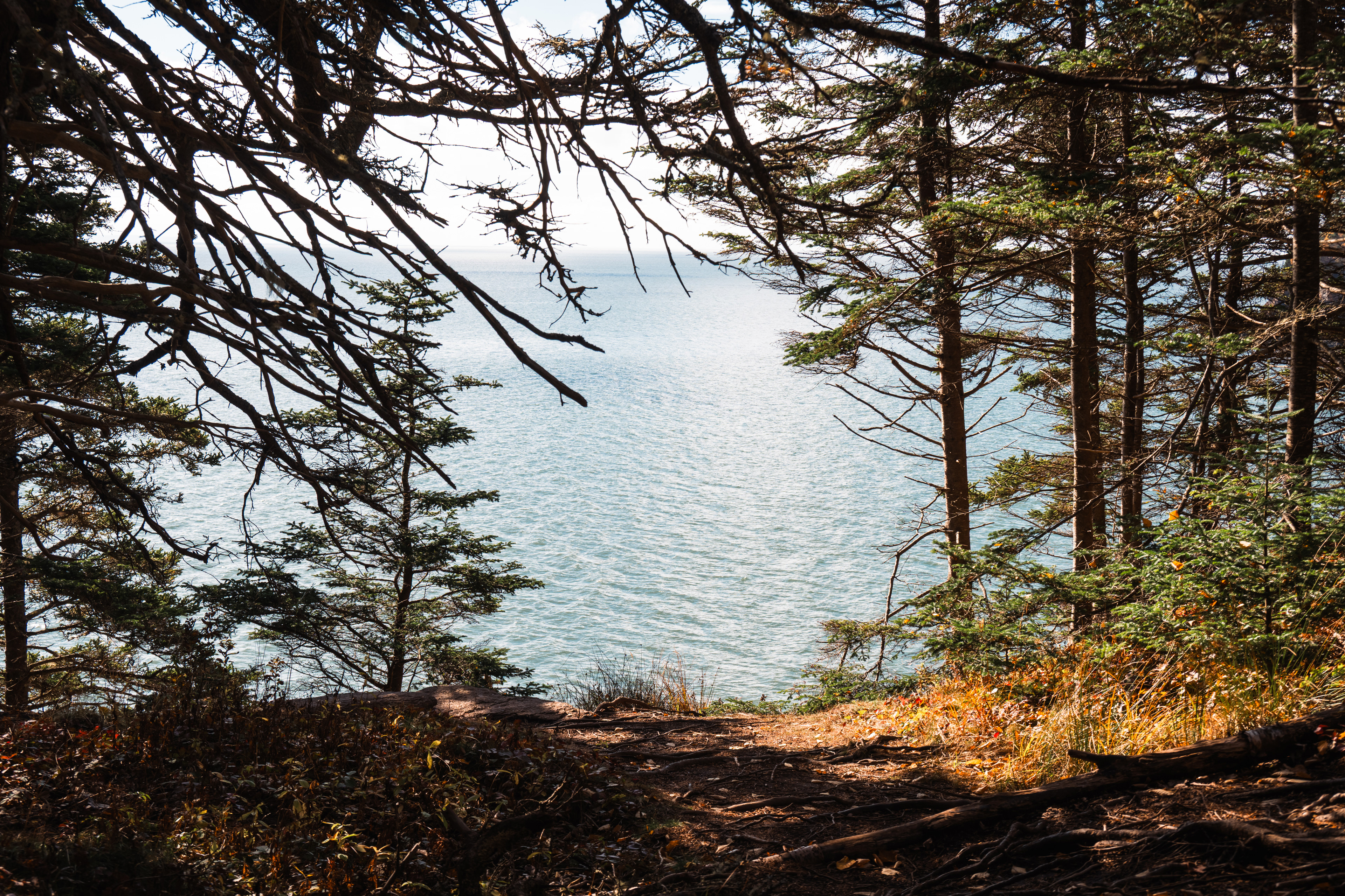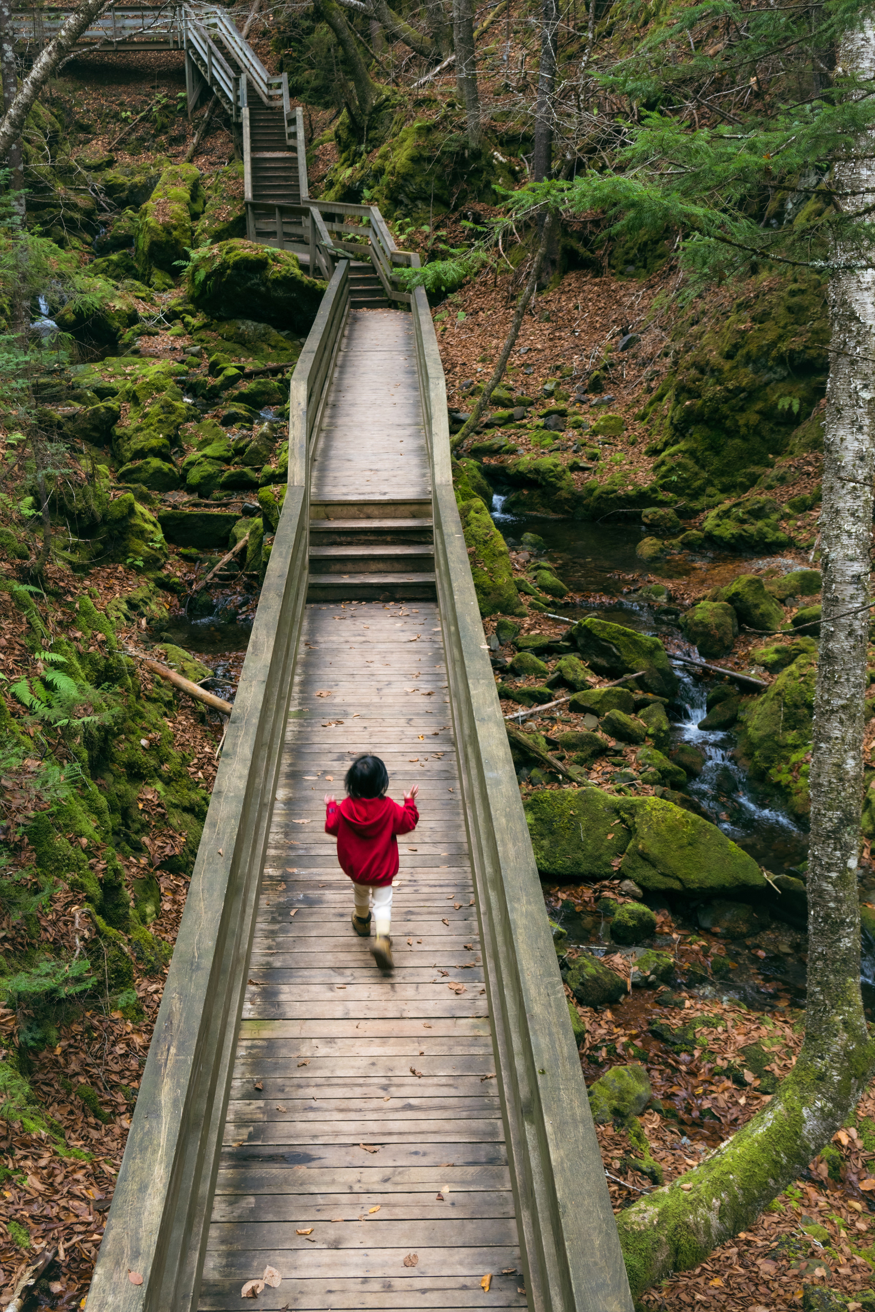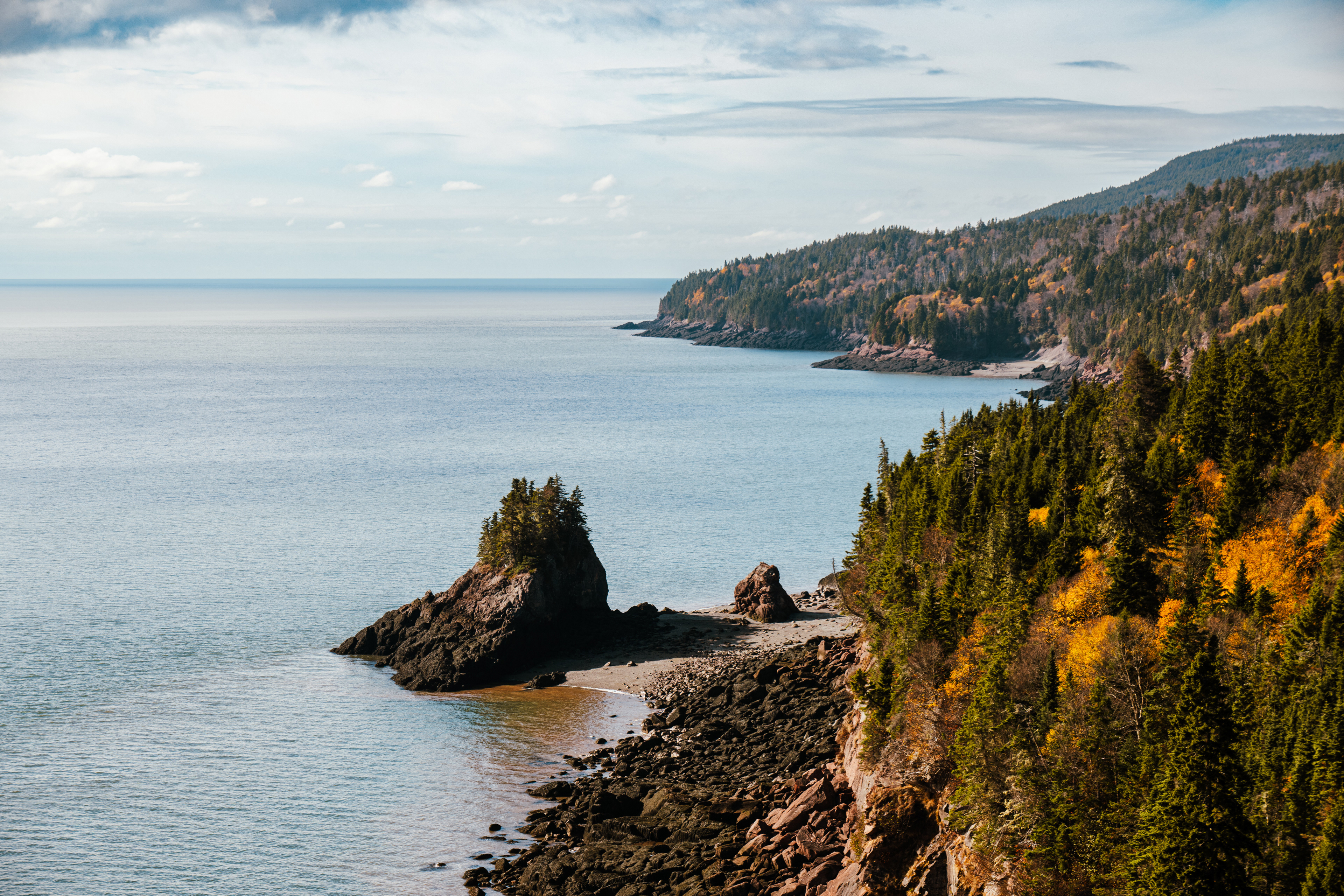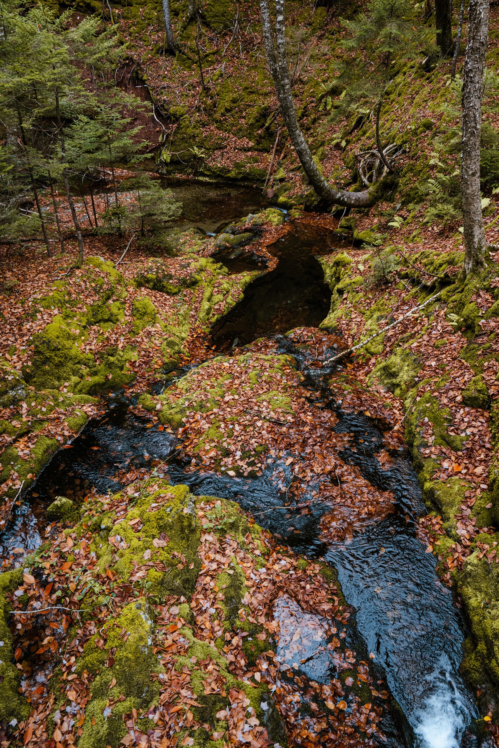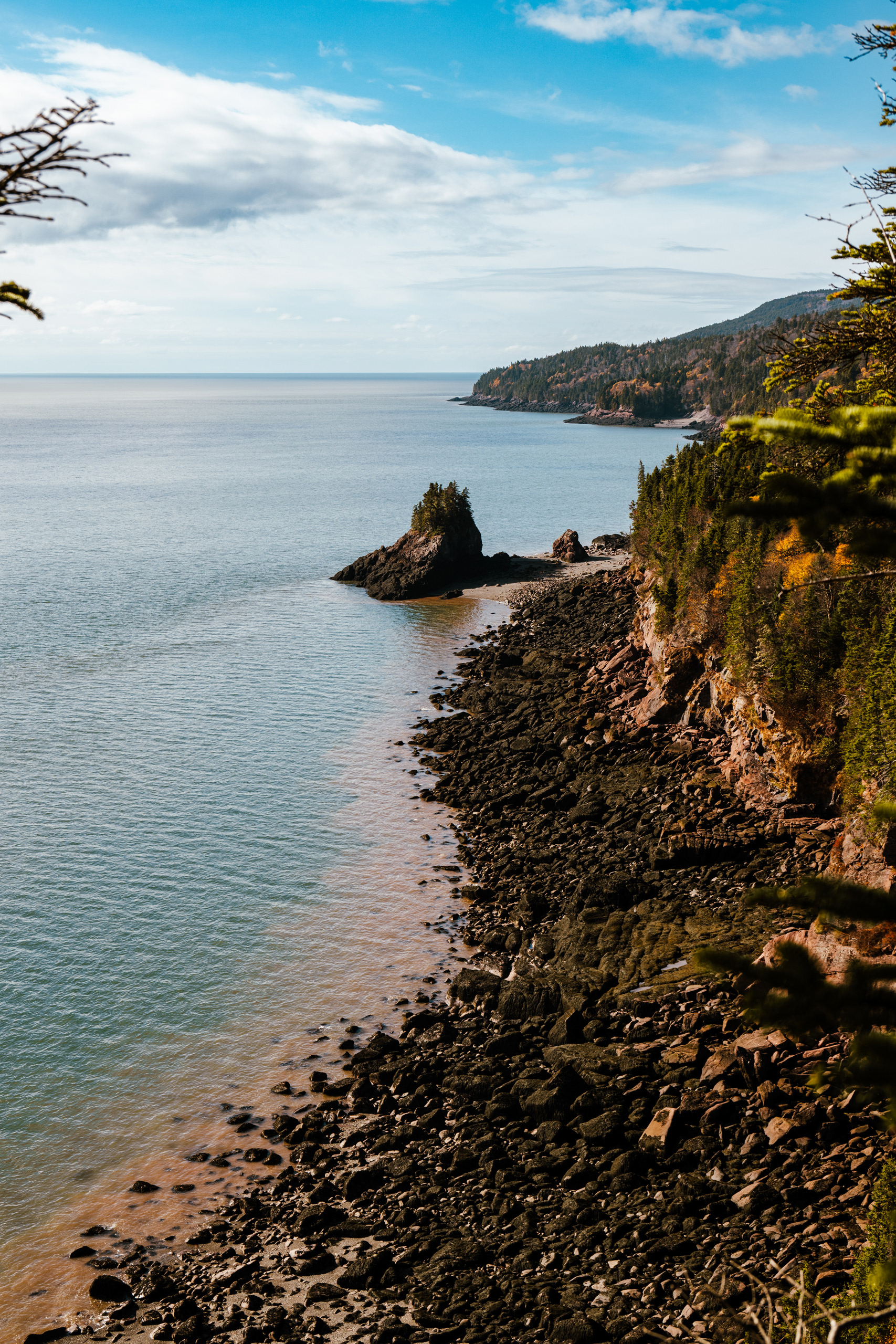 Then, Fundy National Park. The Matthew's Head Trail runs along the cliff edge above the bay, giving you the aerial view: the tidal flats exposed at low tide, stretching hundreds of meters out from the base of the red sandstone cliffs, scored by tidal channels that look from above like the drainage patterns of a river delta in miniature. Dickson Falls, tucked into the forest interior, is the quieter counterpoint — a cascading series of drops over carved rock, shaded by old-growth hemlock, dripping with moss.