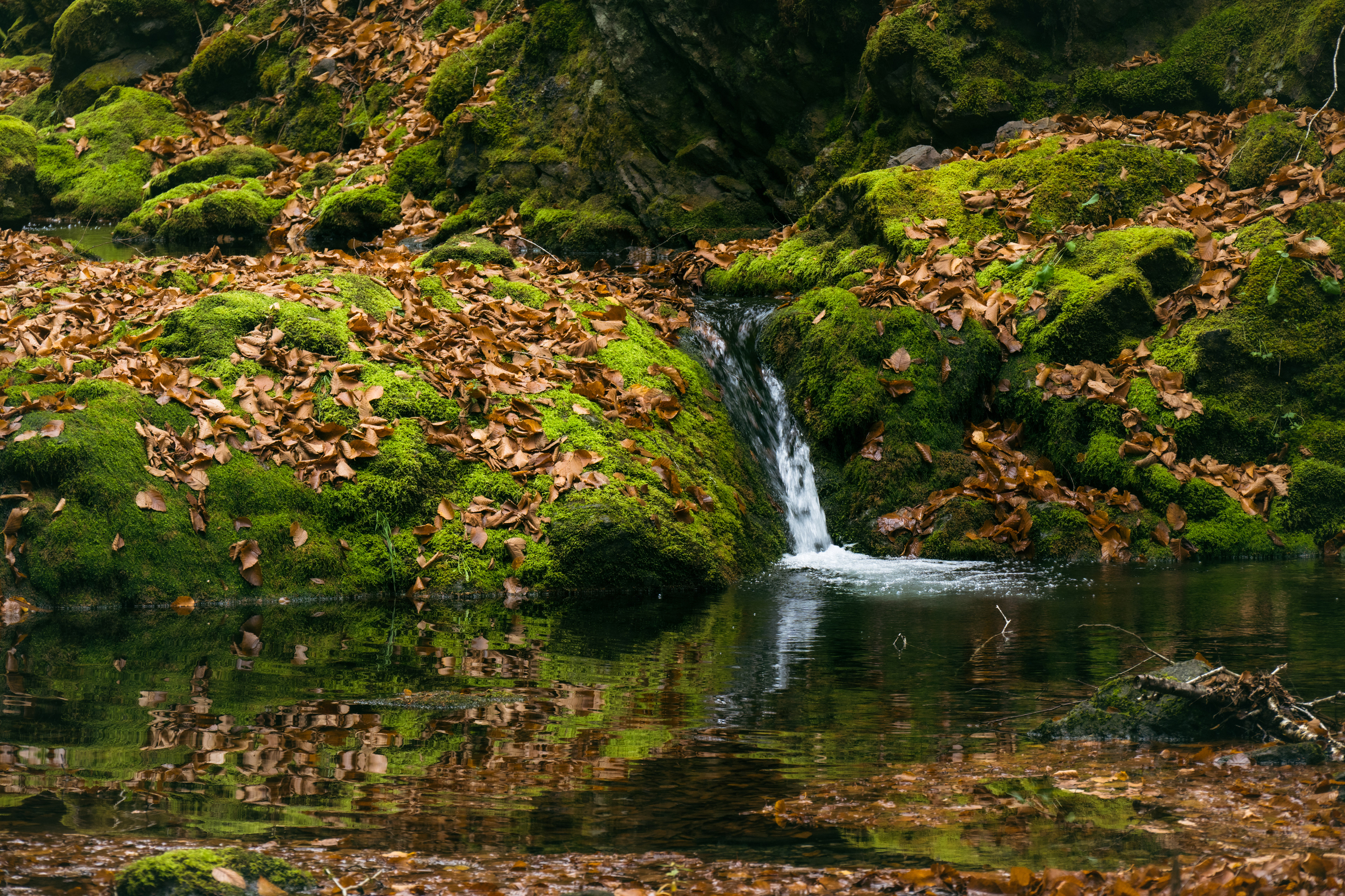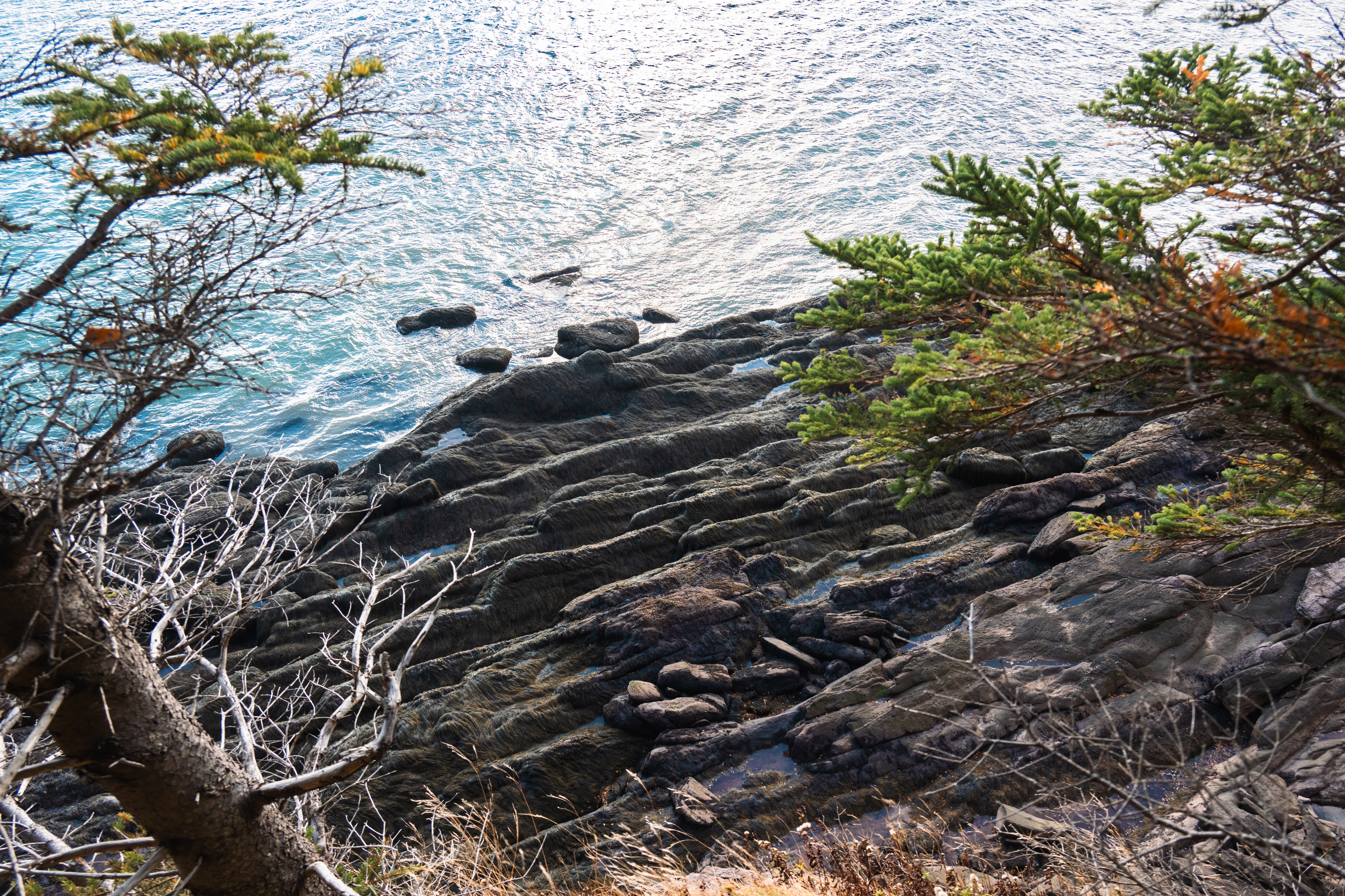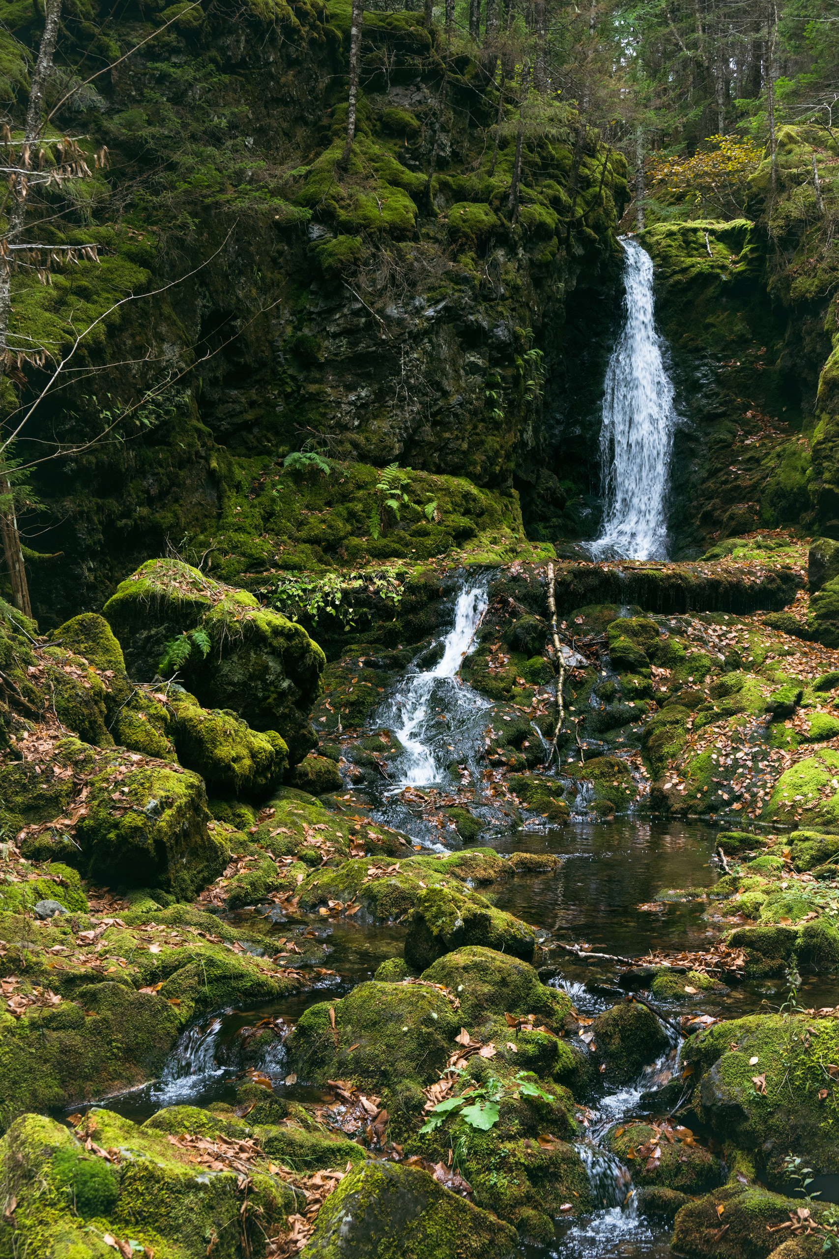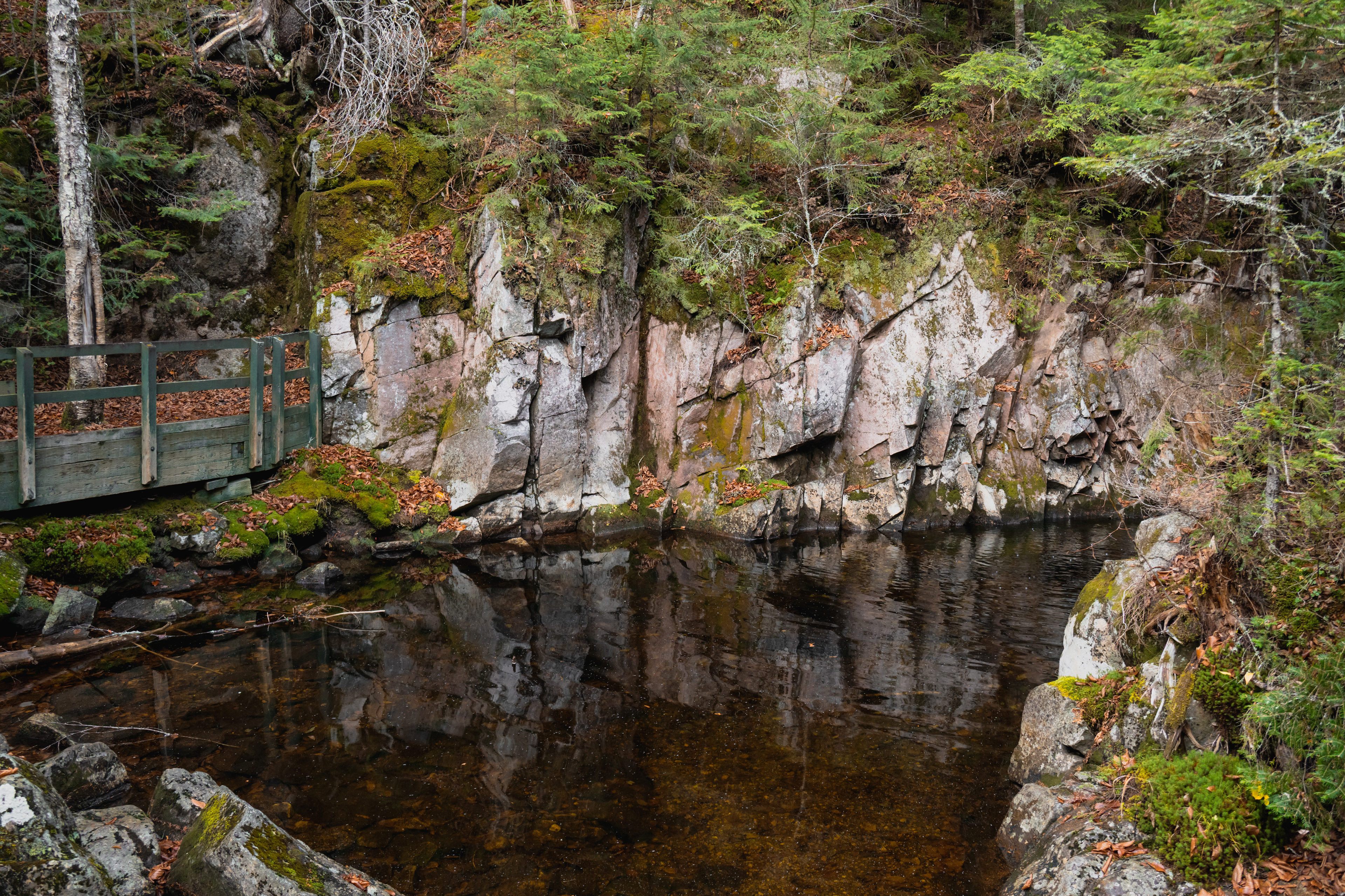 Then, Fundy National Park. The Matthew's Head Trail runs along the cliff edge above the bay, giving you the aerial view: the tidal flats exposed at low tide, stretching hundreds of meters out from the base of the red sandstone cliffs, scored by tidal channels that look from above like the drainage patterns of a river delta in miniature. Dickson Falls, tucked into the forest interior, is the quieter counterpoint — a cascading series of drops over carved rock, shaded by old-growth hemlock, dripping with moss.