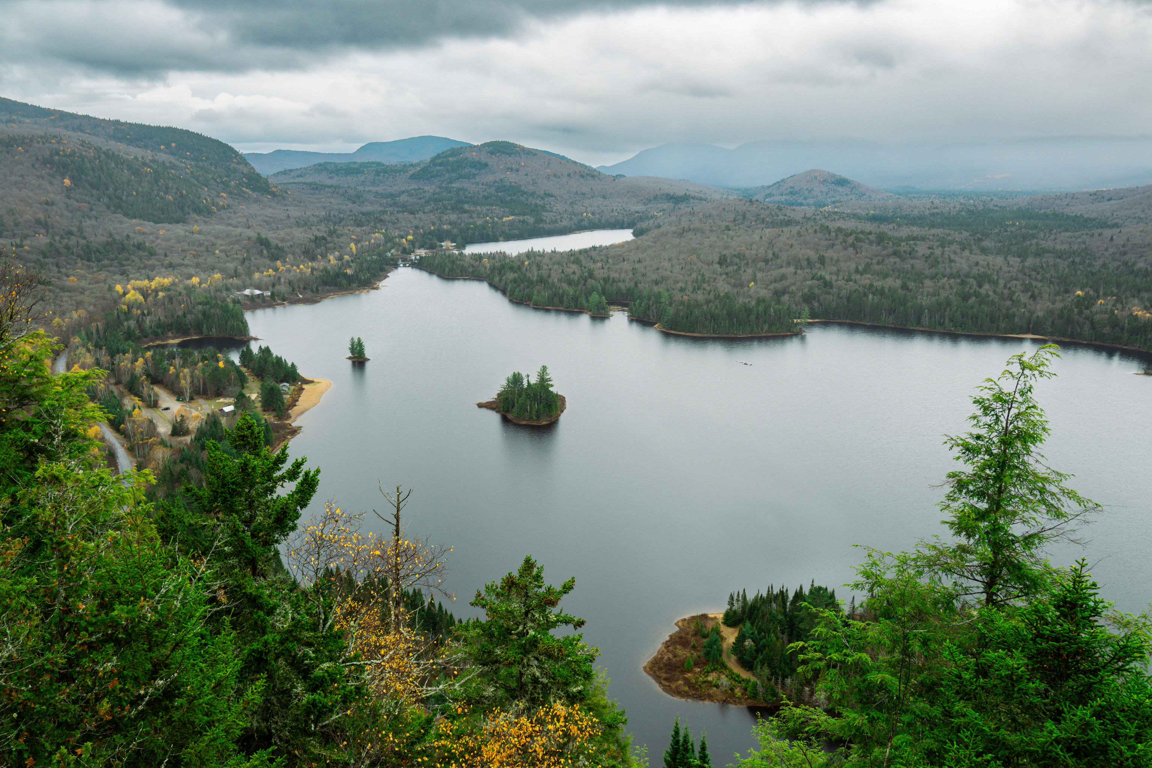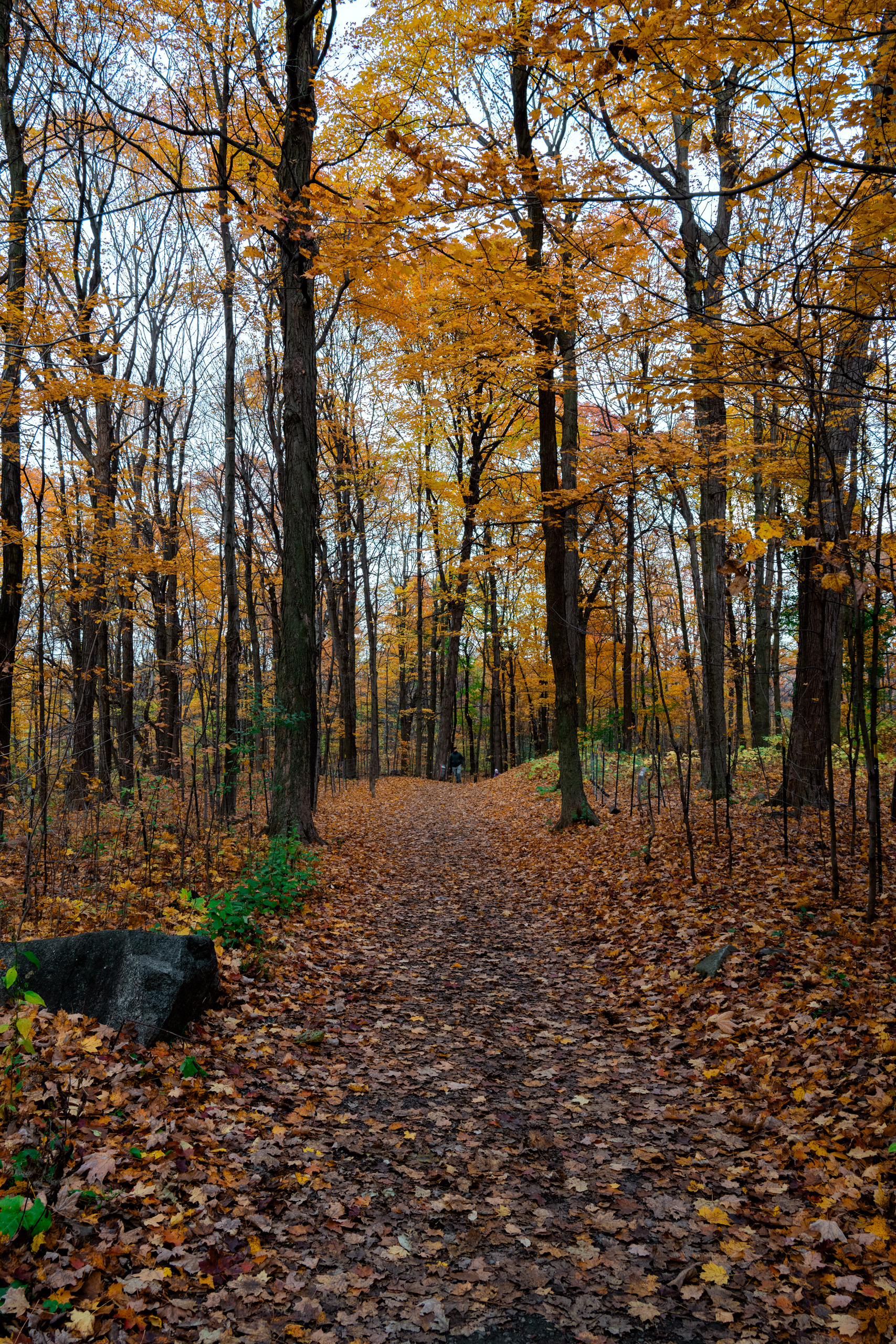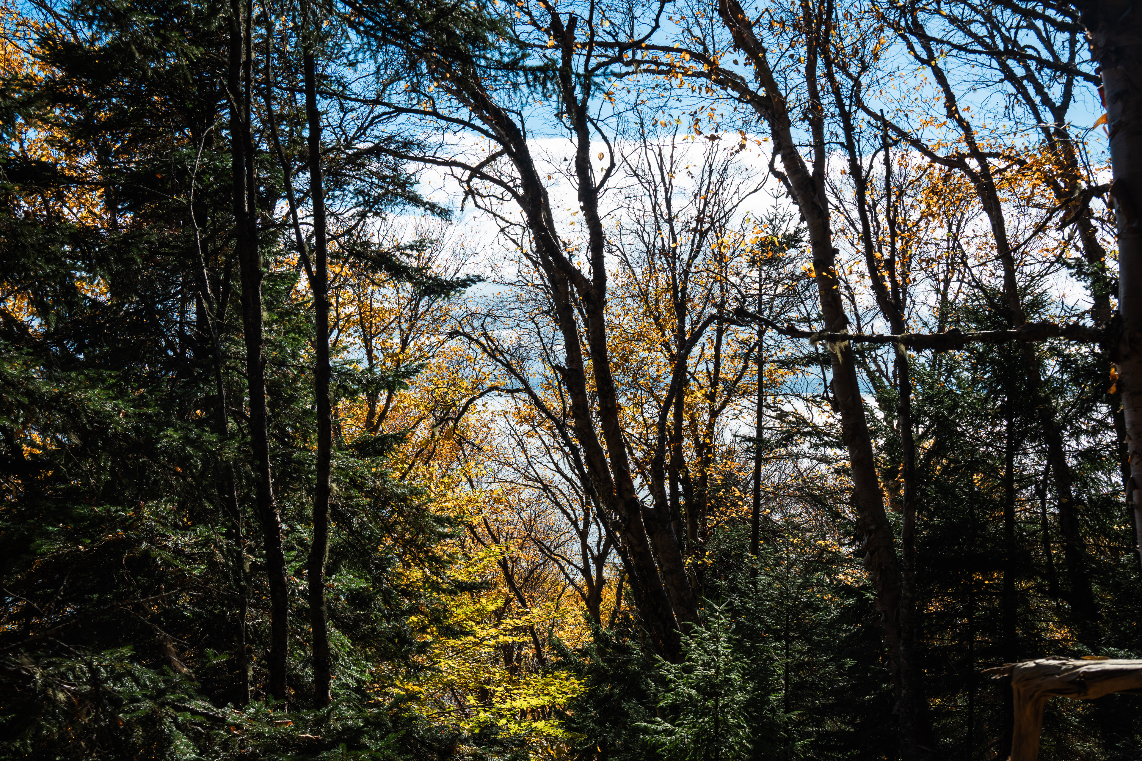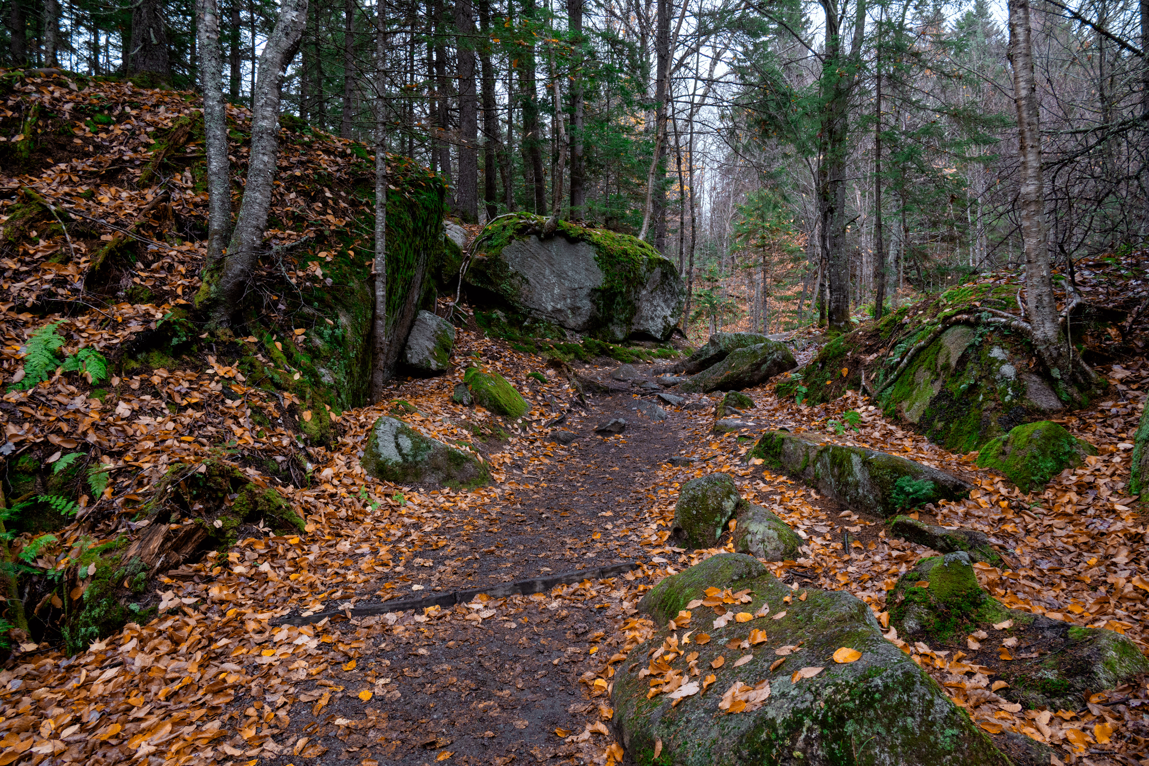 The real payoff was La Corniche and La Roche Loop in Parc national du Mont-Tremblant. The trail gains enough elevation quickly enough that by the time you reach the rocky viewpoint, the valley below has arranged itself into a mosaic that would make a landscape photographer cry. Which, being a landscape photographer, I briefly did. October light at that latitude hits at an angle that makes everything look like it's being viewed through amber glass.