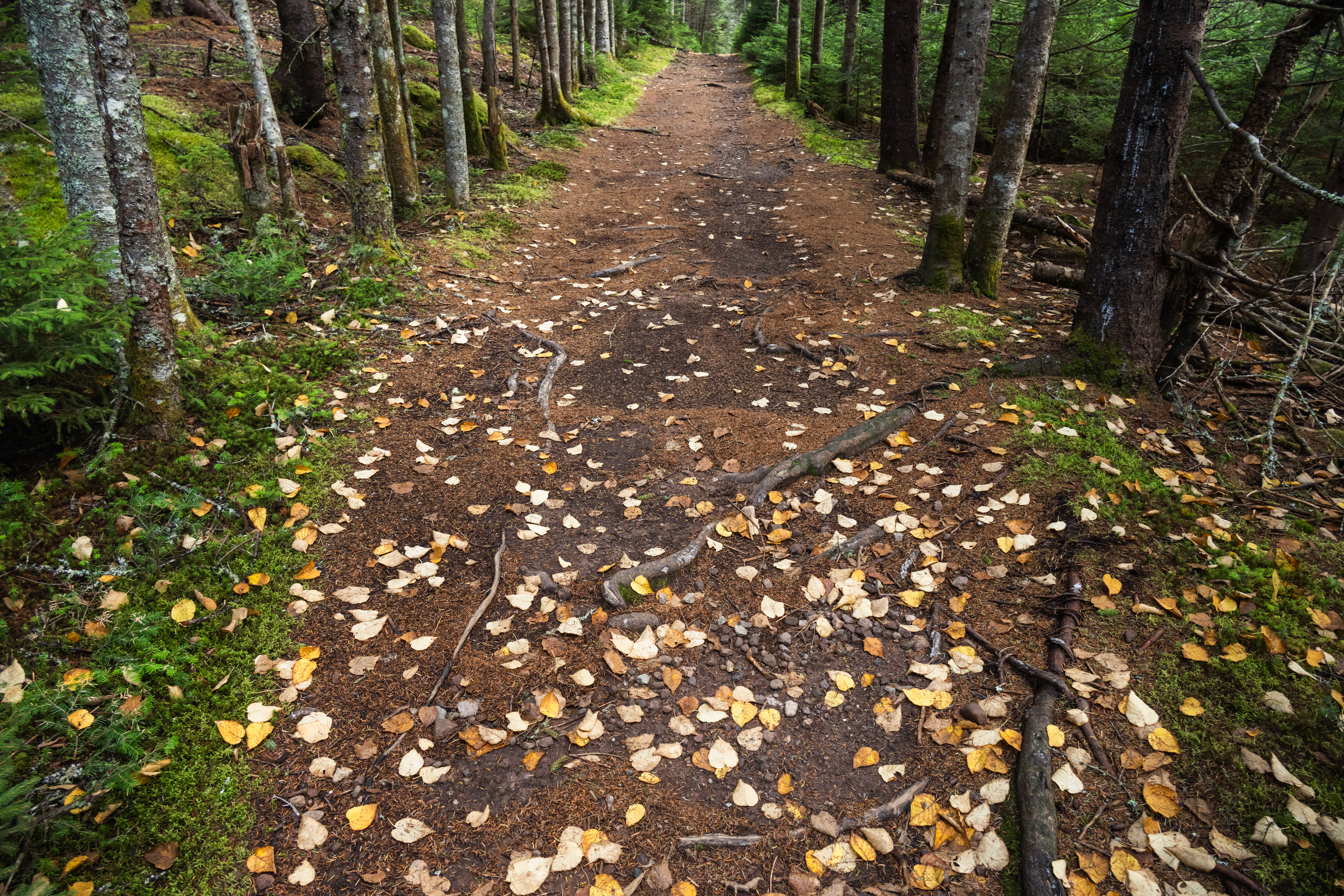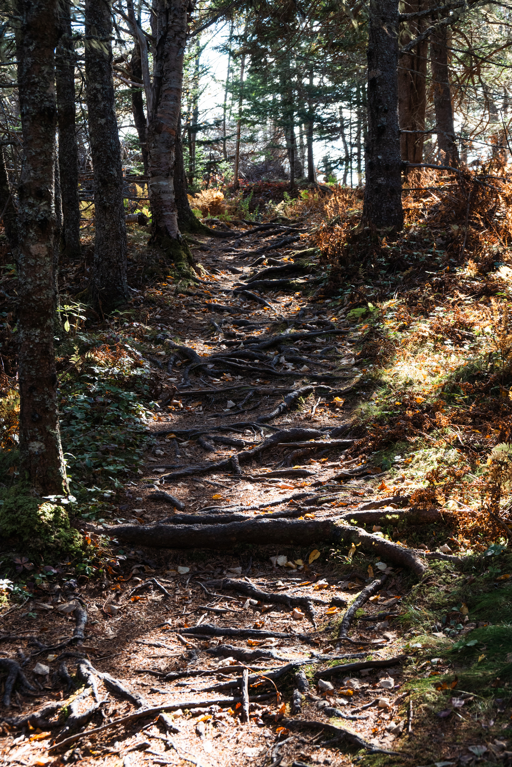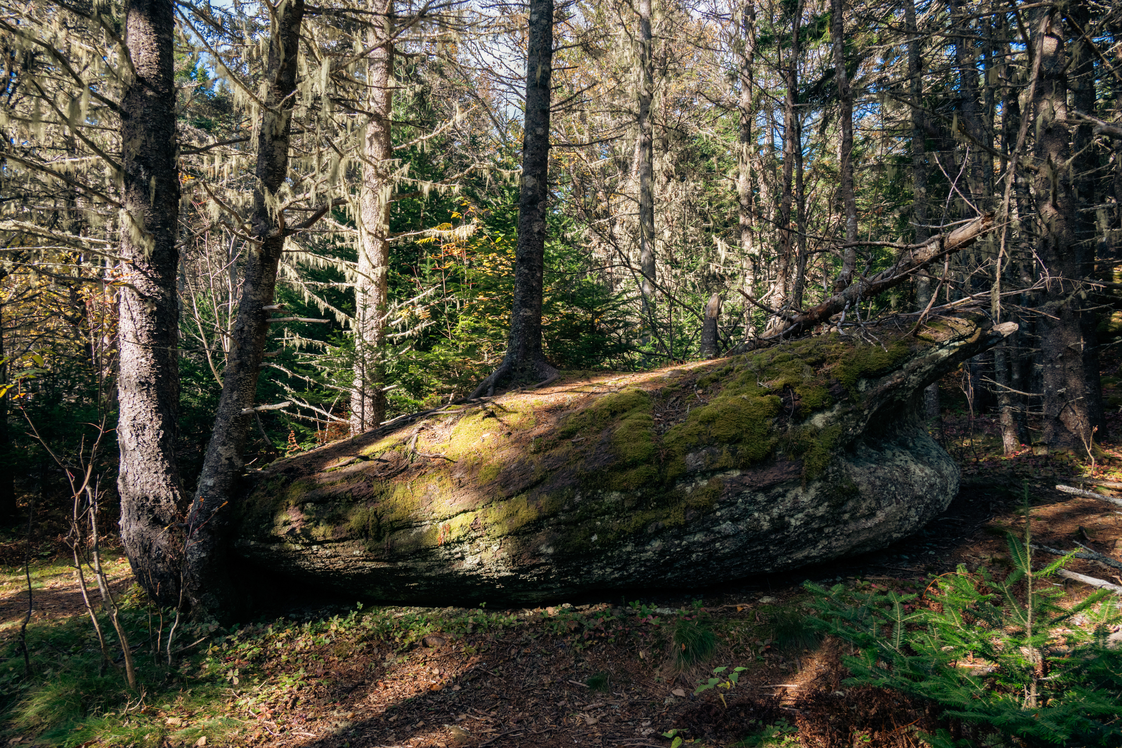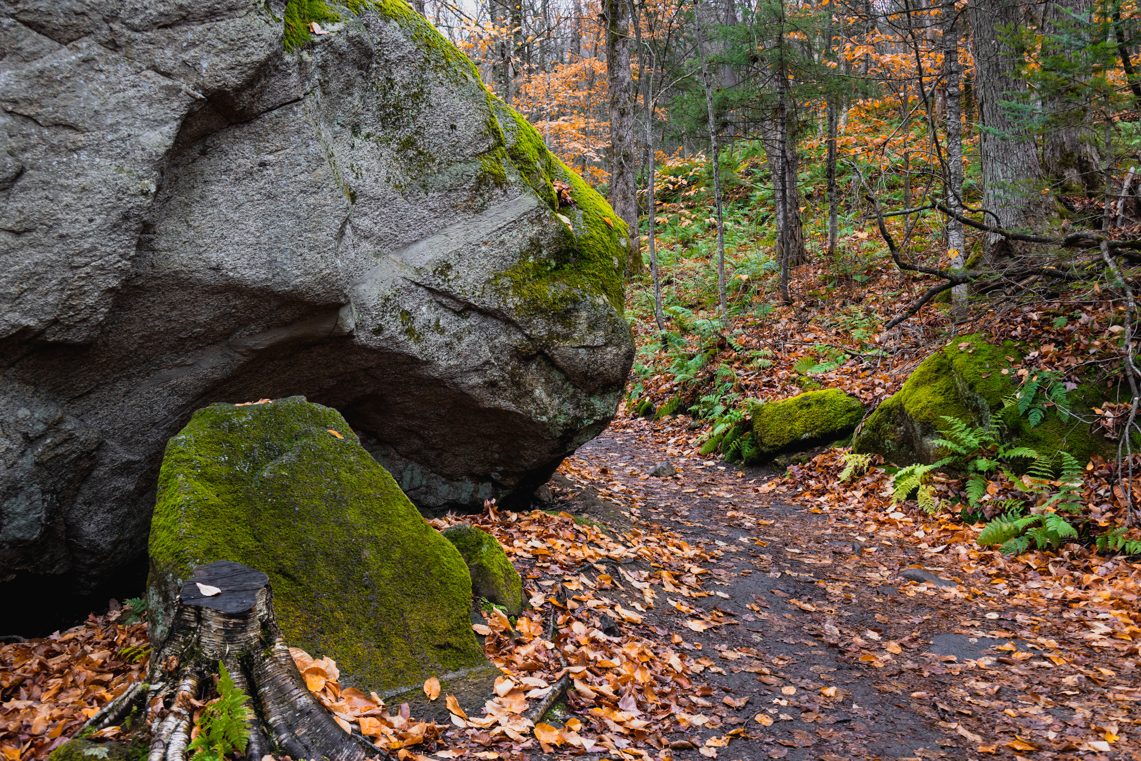 The real payoff was La Corniche and La Roche Loop in Parc national du Mont-Tremblant. The trail gains enough elevation quickly enough that by the time you reach the rocky viewpoint, the valley below has arranged itself into a mosaic that would make a landscape photographer cry. Which, being a landscape photographer, I briefly did. October light at that latitude hits at an angle that makes everything look like it's being viewed through amber glass.