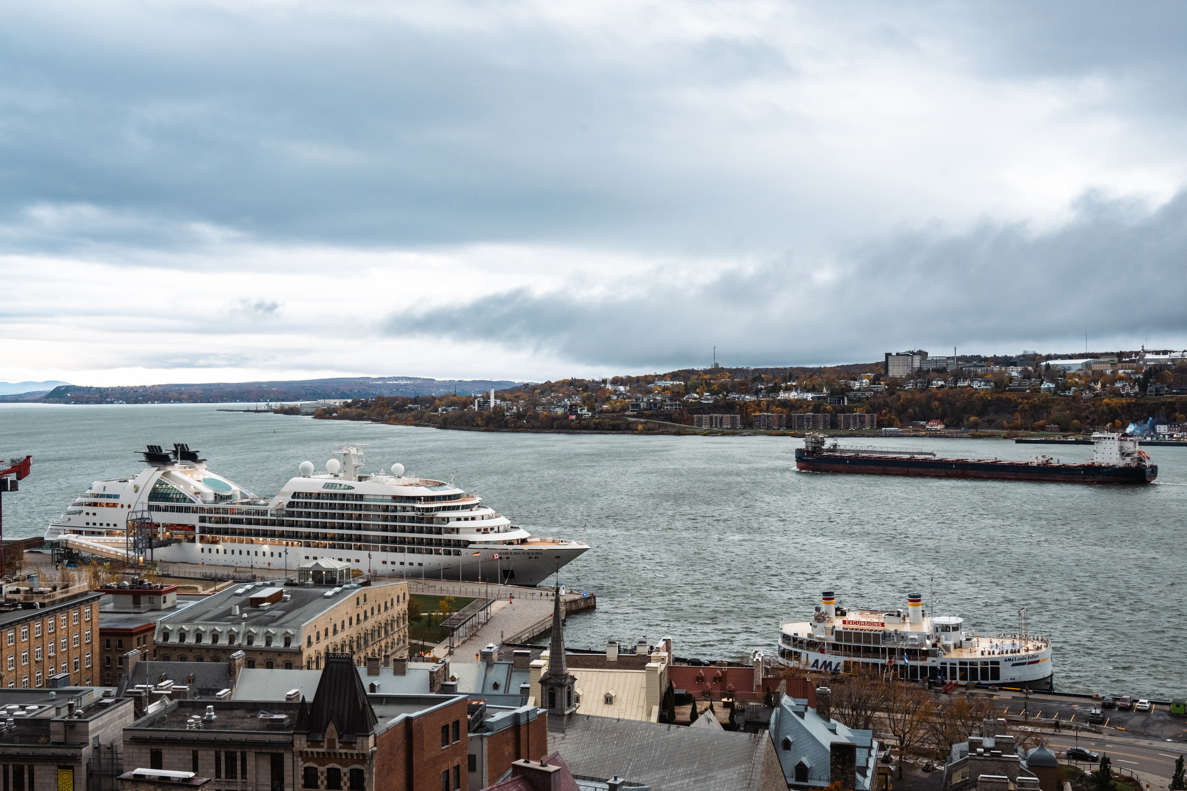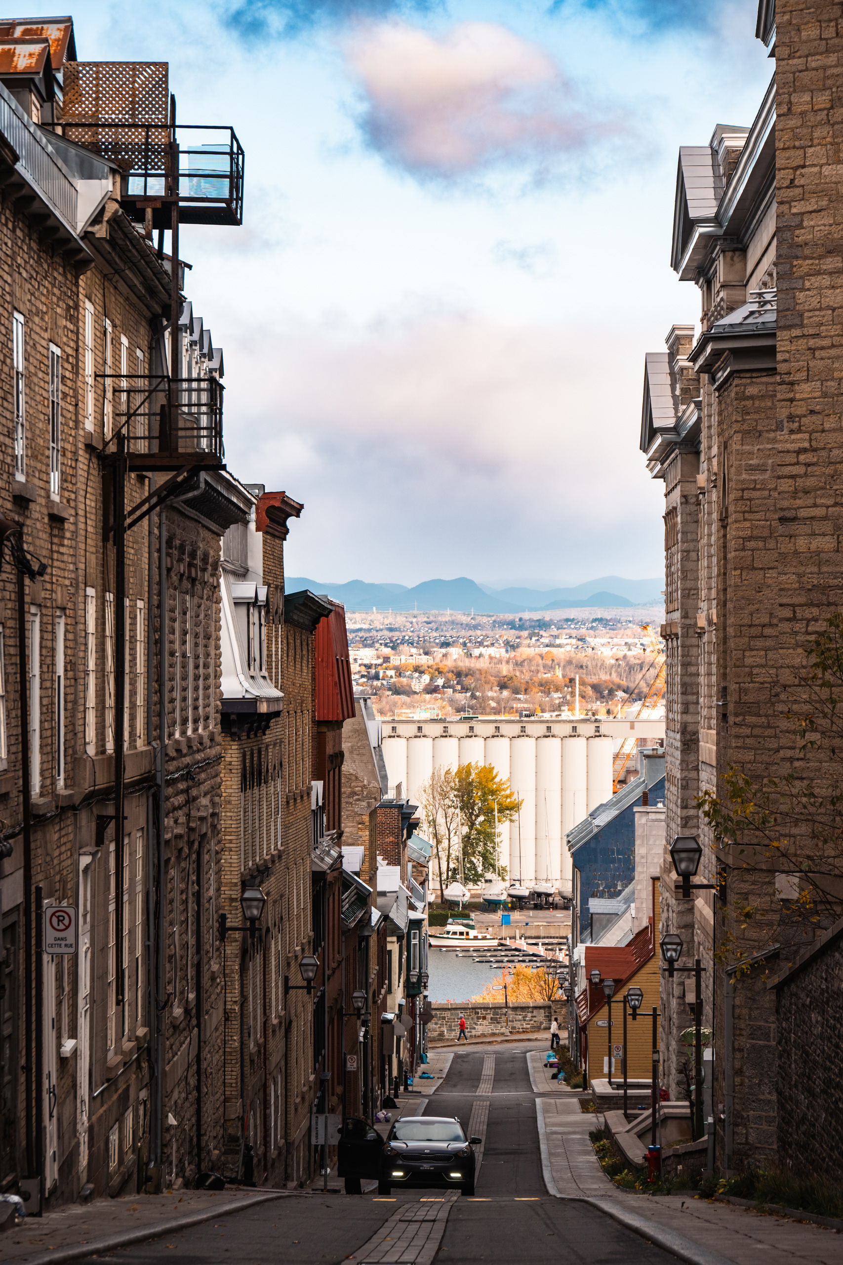 Across the province border, Québec's highway signs shift entirely to French. The topography changes too: the forest gets denser, the highway climbs, and by the time you descend toward the St. Lawrence River the afternoon light is doing something golden and specific to the valley that makes you want to photograph it and also just sit with it. We did both.