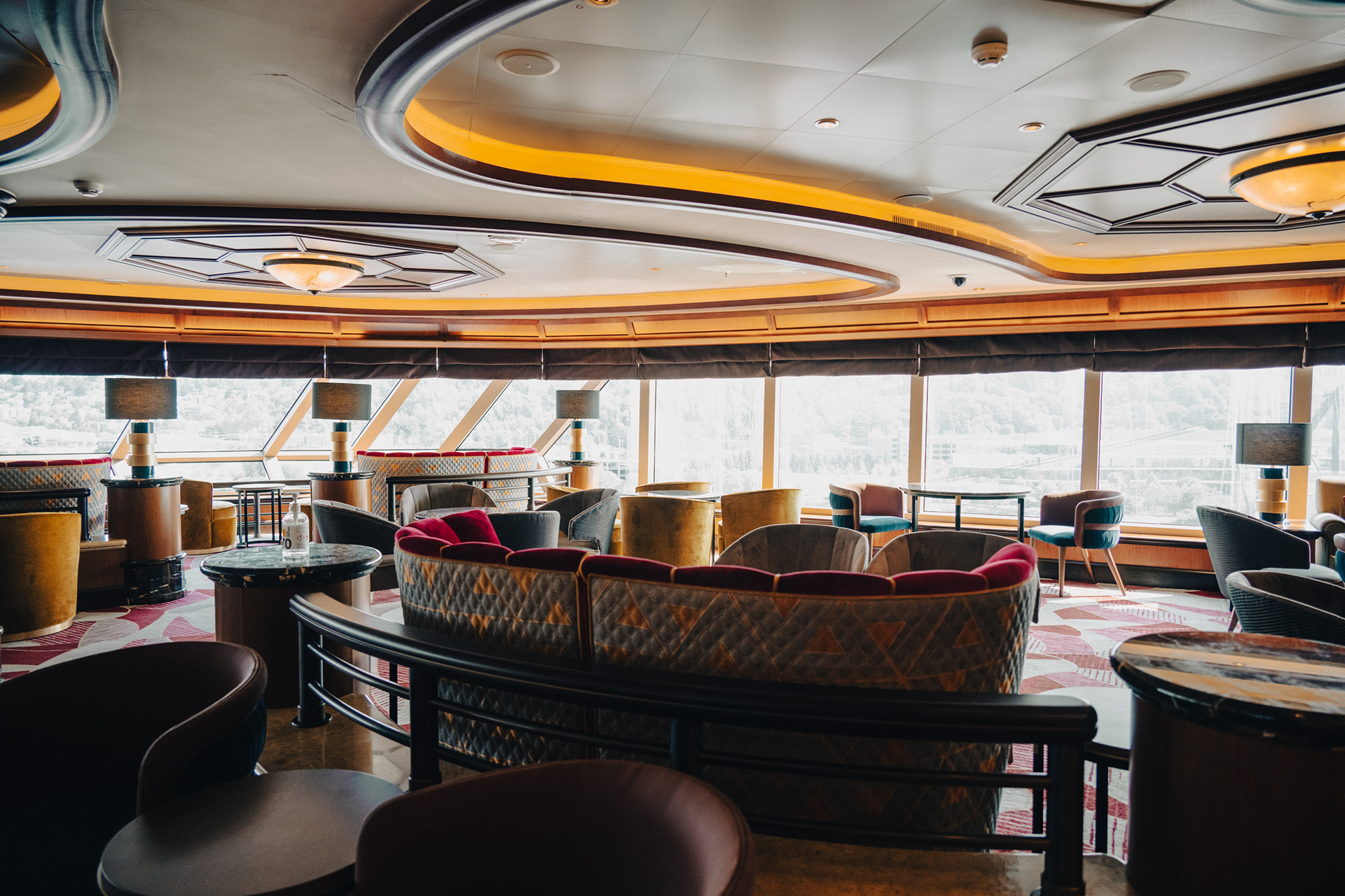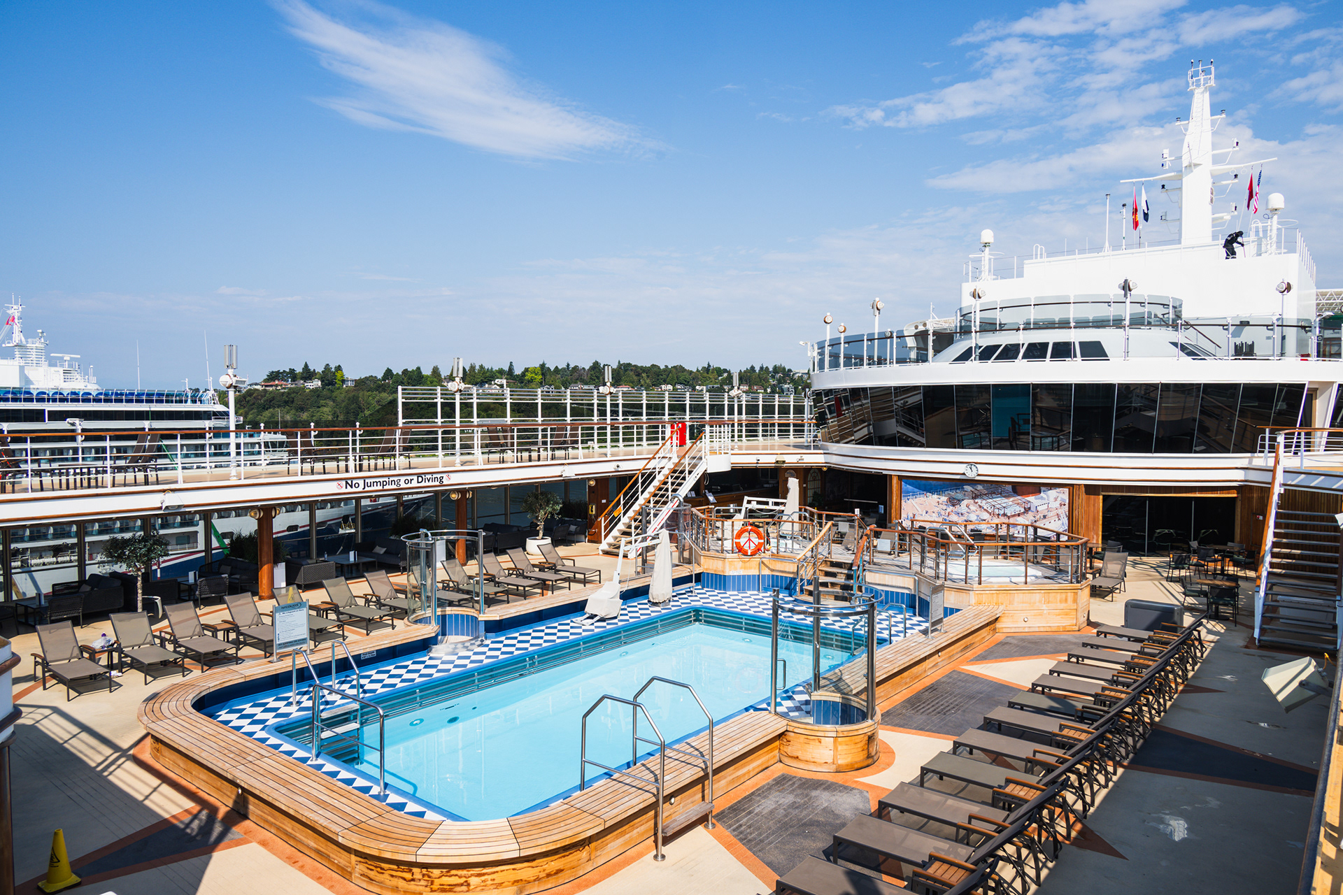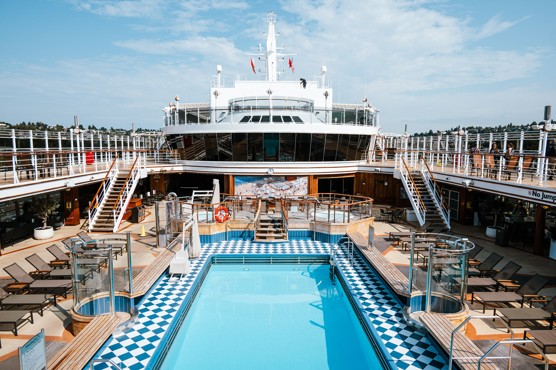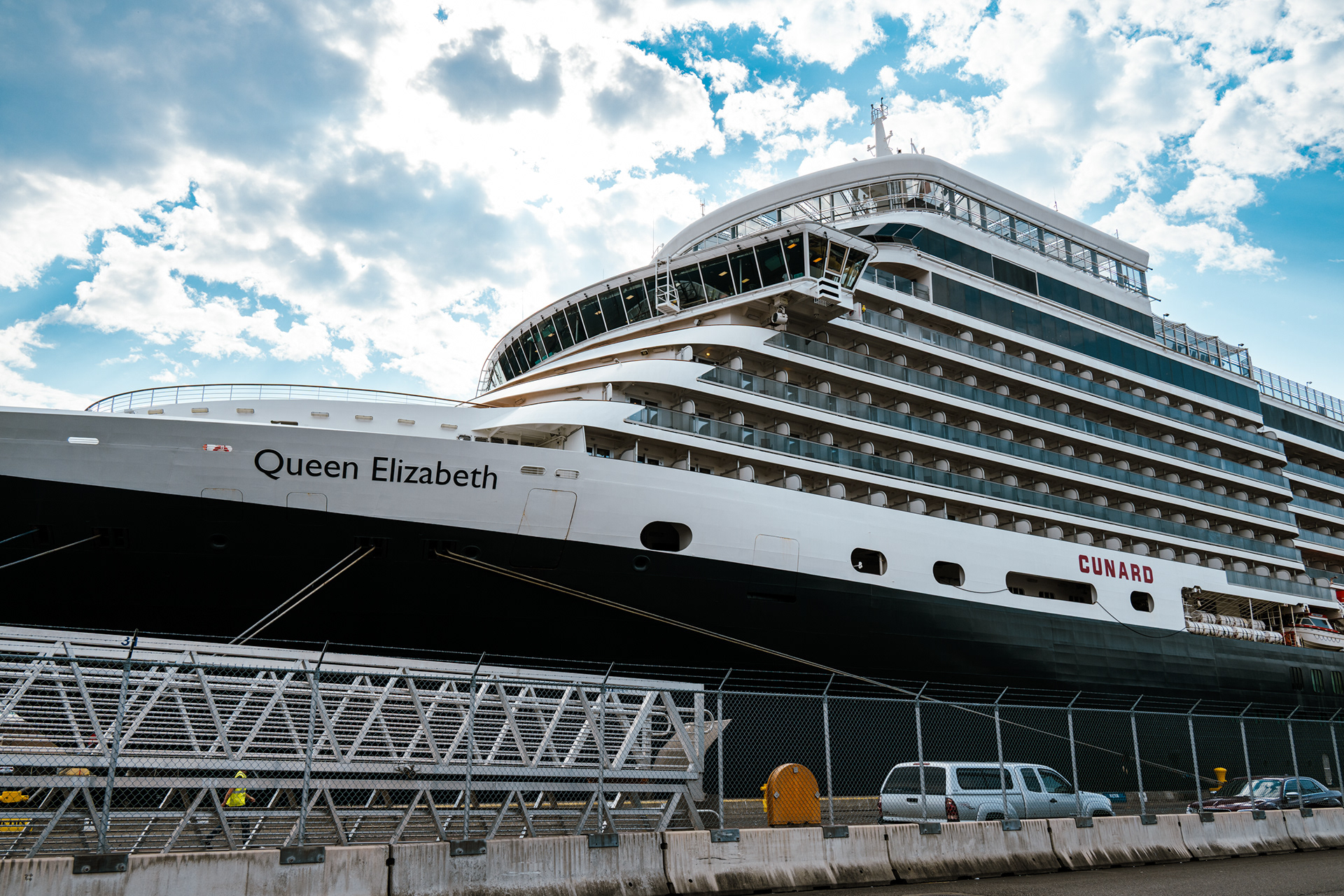 Docked at Seattle’s scenic waterfront, the Queen Elizabeth makes a regal impression against the Pacific Northwest backdrop. As a member of the Vista class, this ship is a tribute to the "Golden Age" of ocean travel—evoking the elegance of the 1930s with its Art Deco interiors and striking black hull. With 12 passenger decks and a capacity for 2,081 guests, the ship feels intimate yet grand, boasting a royal connection unmatched by any other line; its godmother was none other than Her Majesty Queen Elizabeth II, who named the ship in 2010.