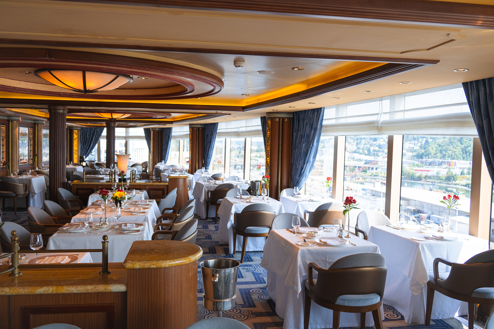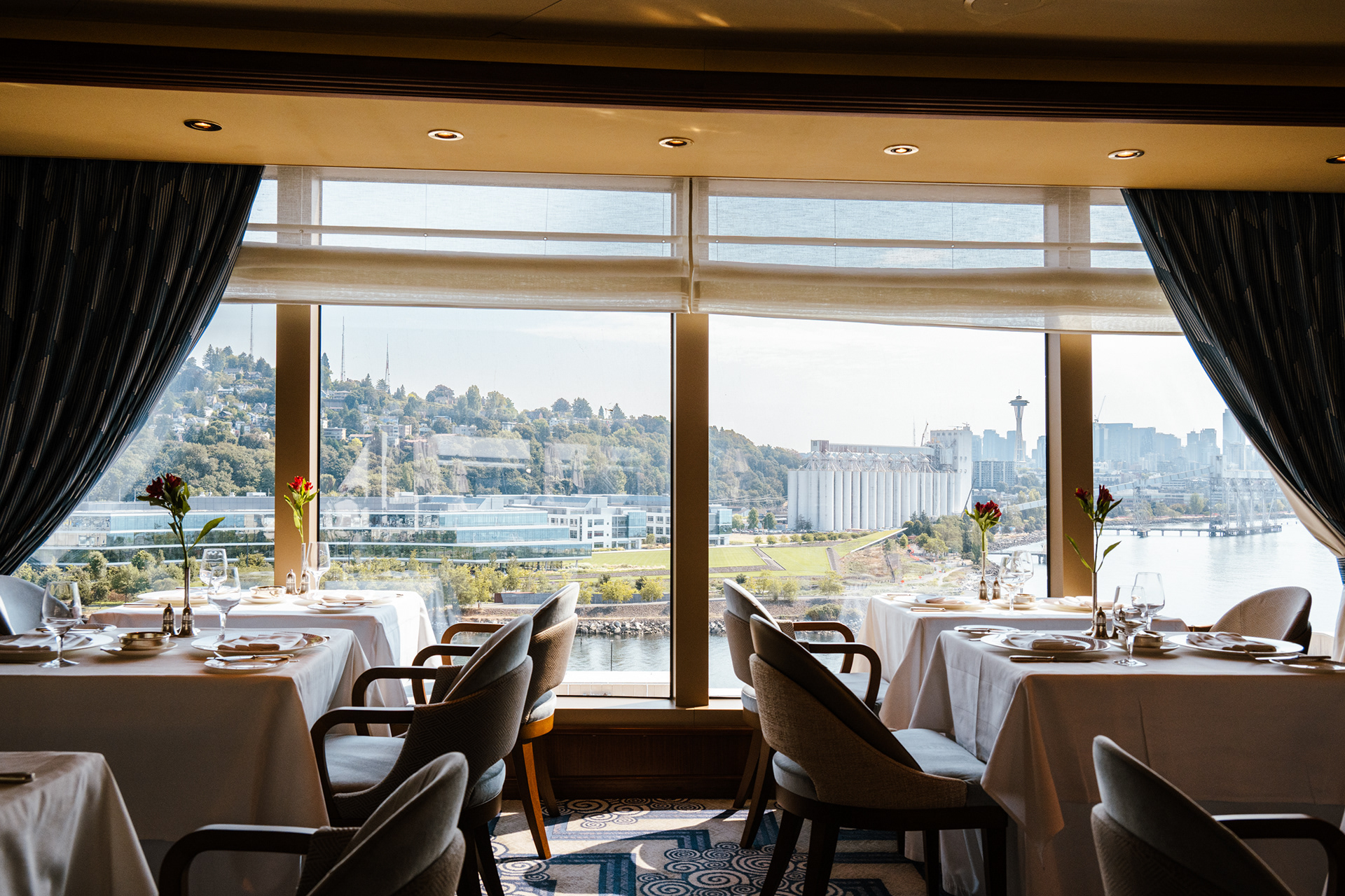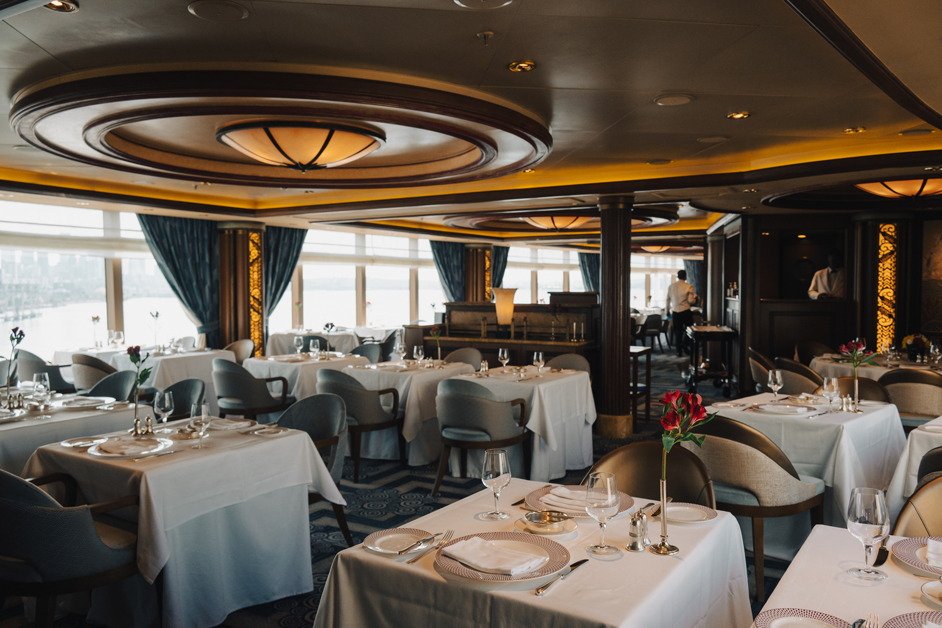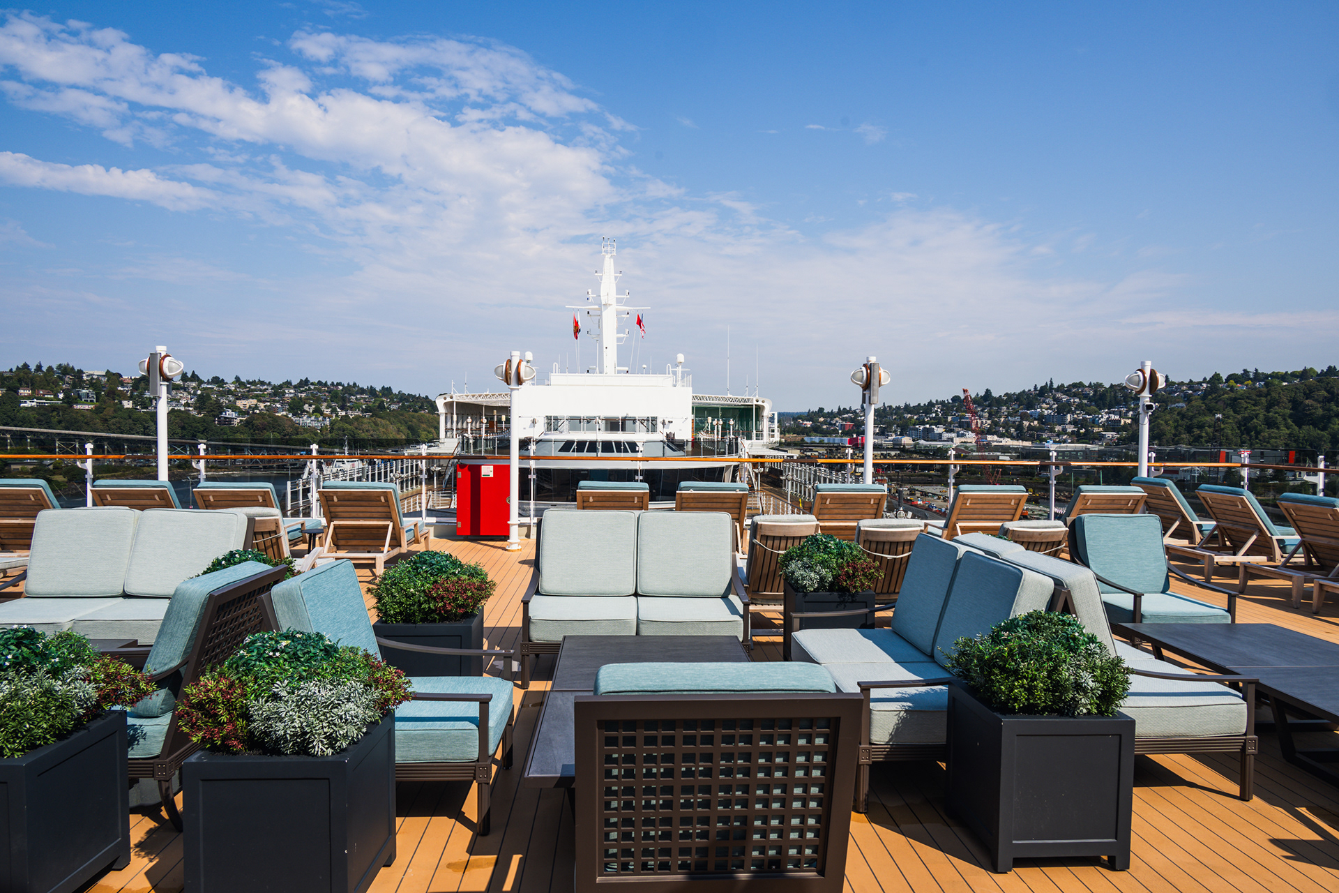 Docked at Seattle’s scenic waterfront, the Queen Elizabeth makes a regal impression against the Pacific Northwest backdrop. As a member of the Vista class, this ship is a tribute to the "Golden Age" of ocean travel—evoking the elegance of the 1930s with its Art Deco interiors and striking black hull. With 12 passenger decks and a capacity for 2,081 guests, the ship feels intimate yet grand, boasting a royal connection unmatched by any other line; its godmother was none other than Her Majesty Queen Elizabeth II, who named the ship in 2010.