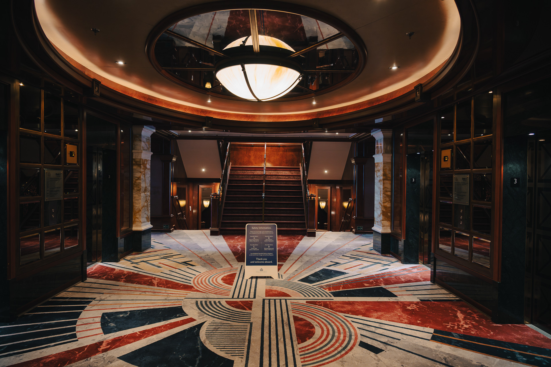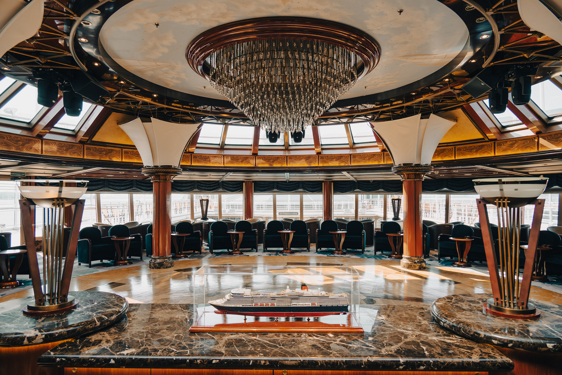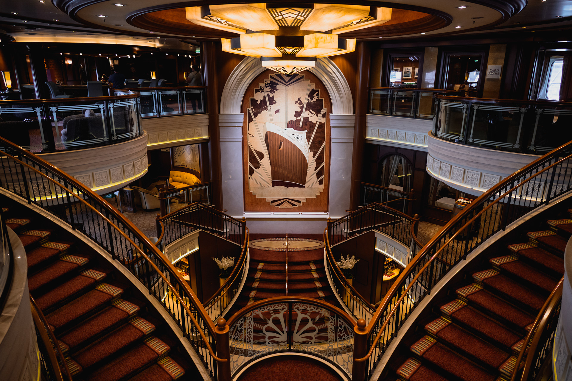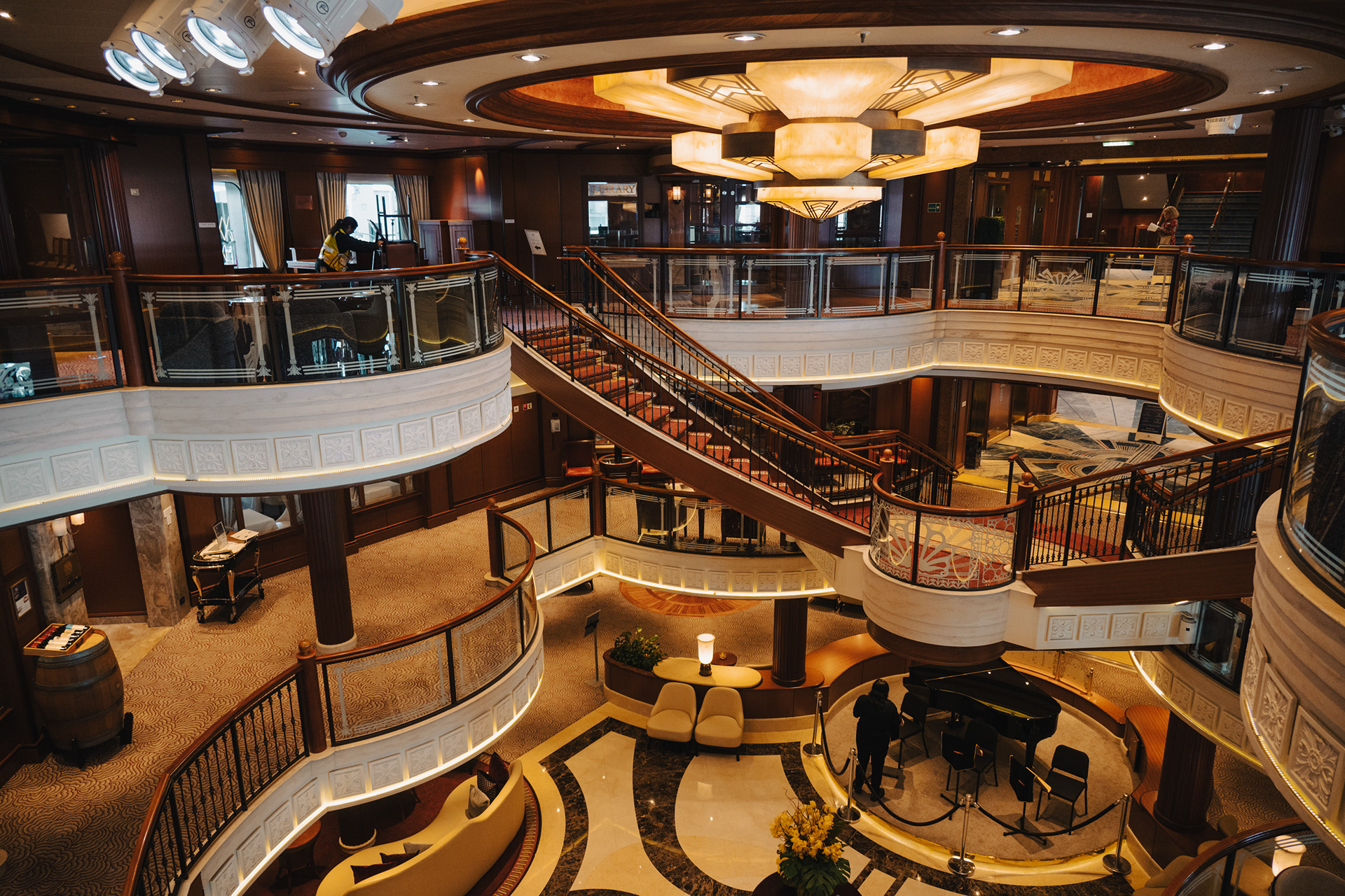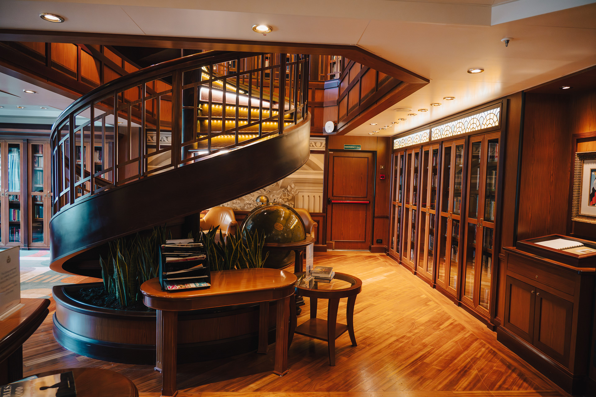 Our tour took us through the sophisticated heart of the vessel, starting with the Grand Lobby, a stunning three-story atrium featuring a marquetry panel of the original Queen Elizabeth liner. We explored the unique Games Deck where guests can play croquet and bowls under the open sky, peeked into the famous two-story Library with its iconic wooden spiral staircase, and admired the Queens Room, the largest ballroom at sea. To top off the experience, we watched part of a show in the ship's theatre and enjoyed a delicious lunch at the elegant Britannia Restaurant. Whether you're a fan of maritime tradition or just looking for a refined escape, the Queen Elizabeth offers a timeless glimpse into the art of cruising.