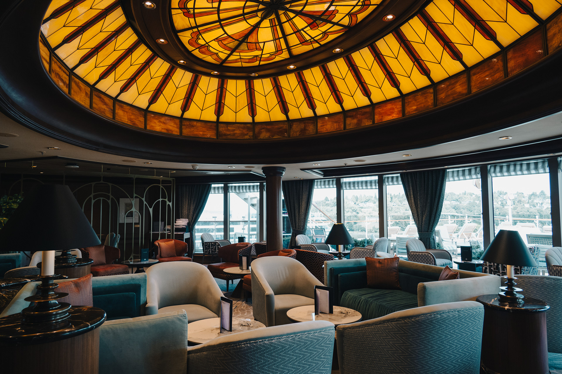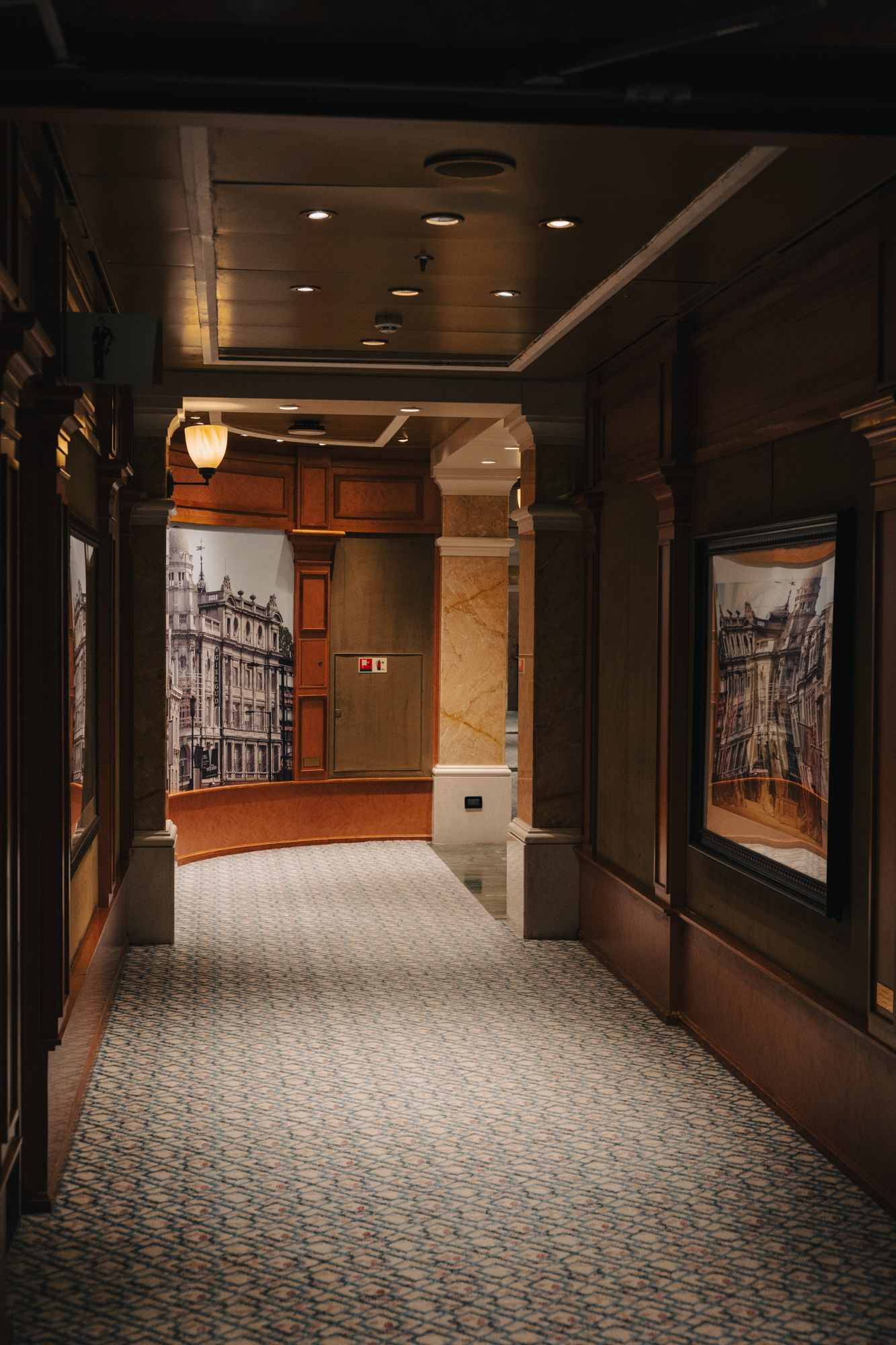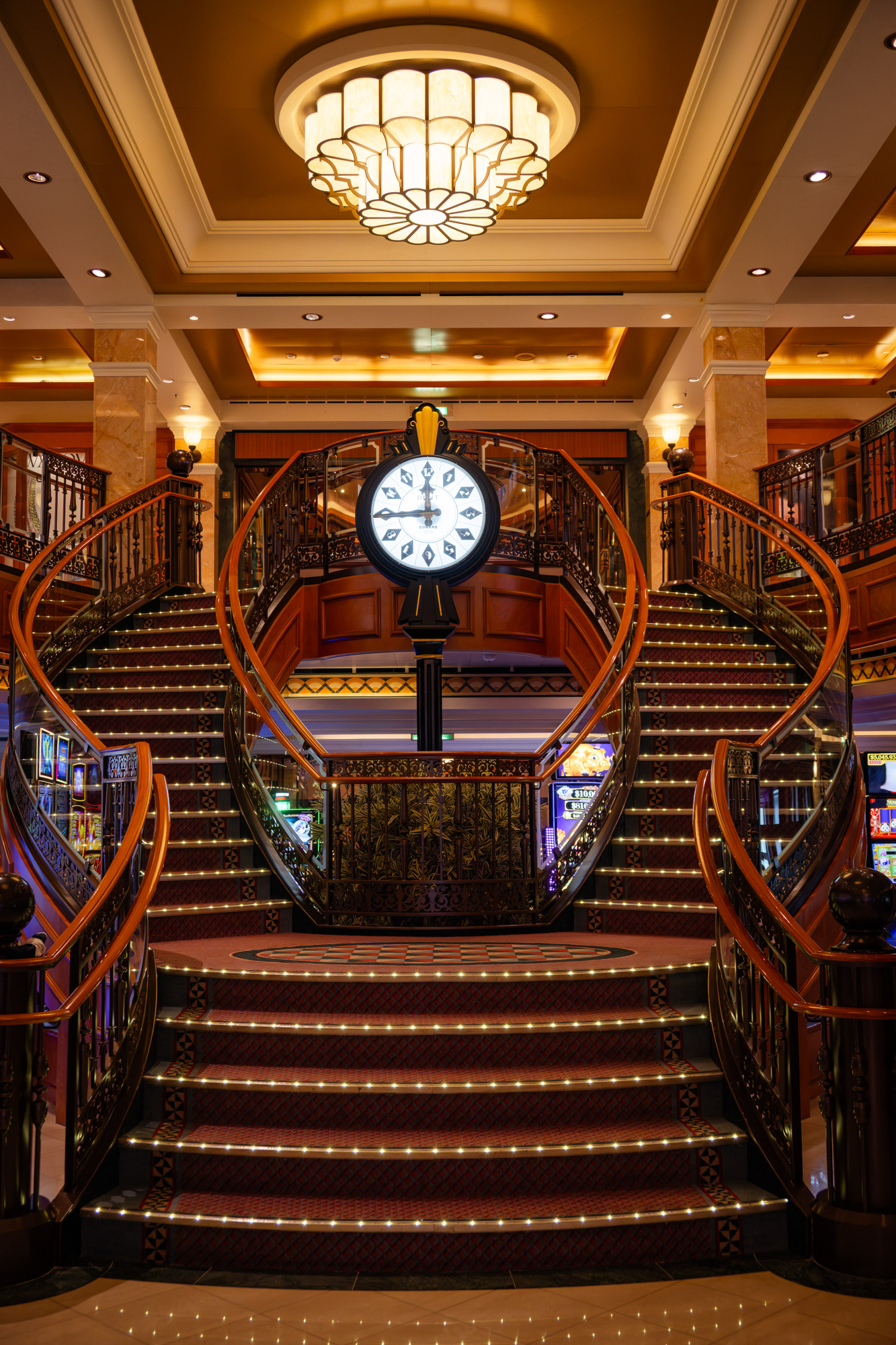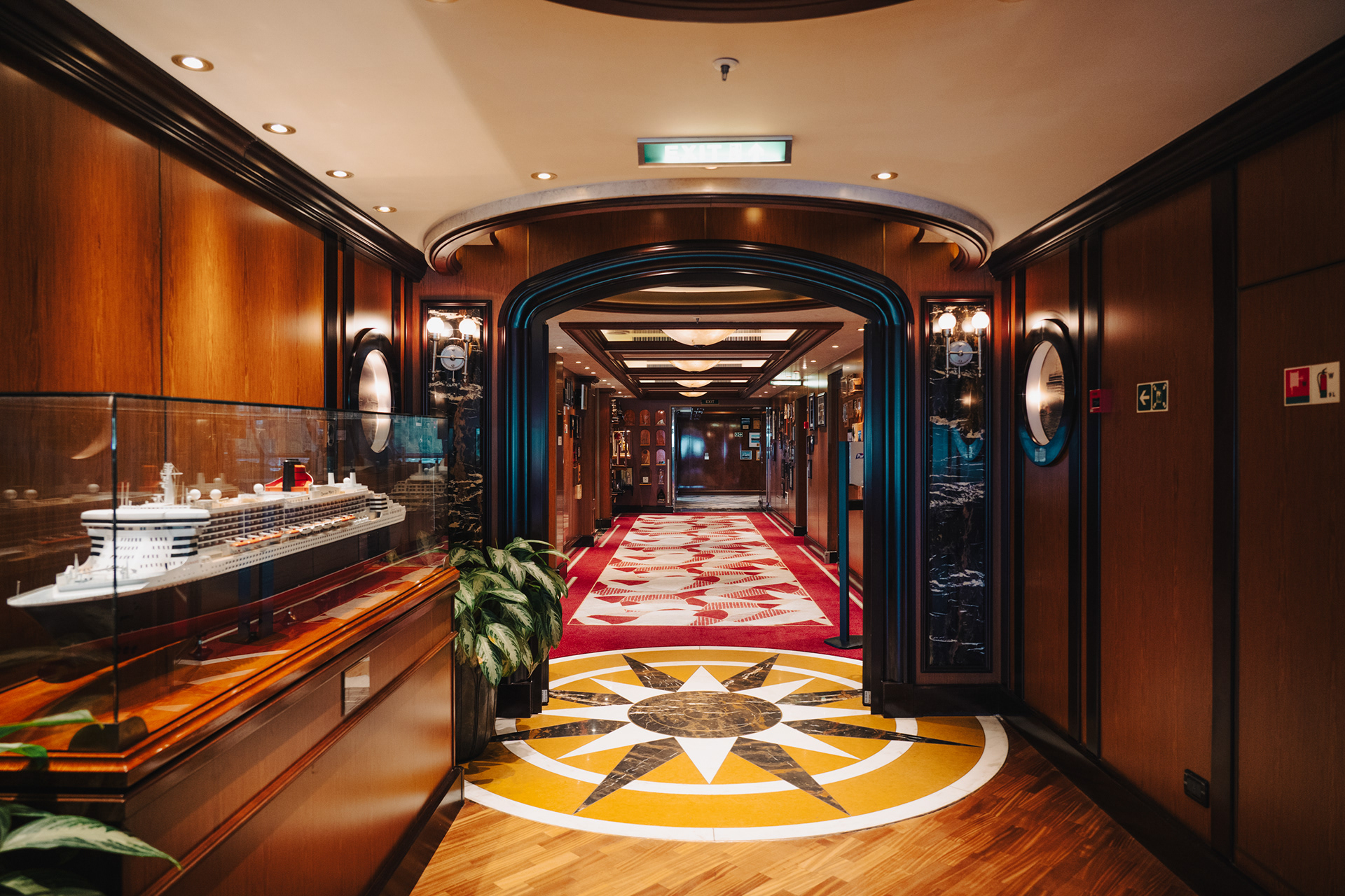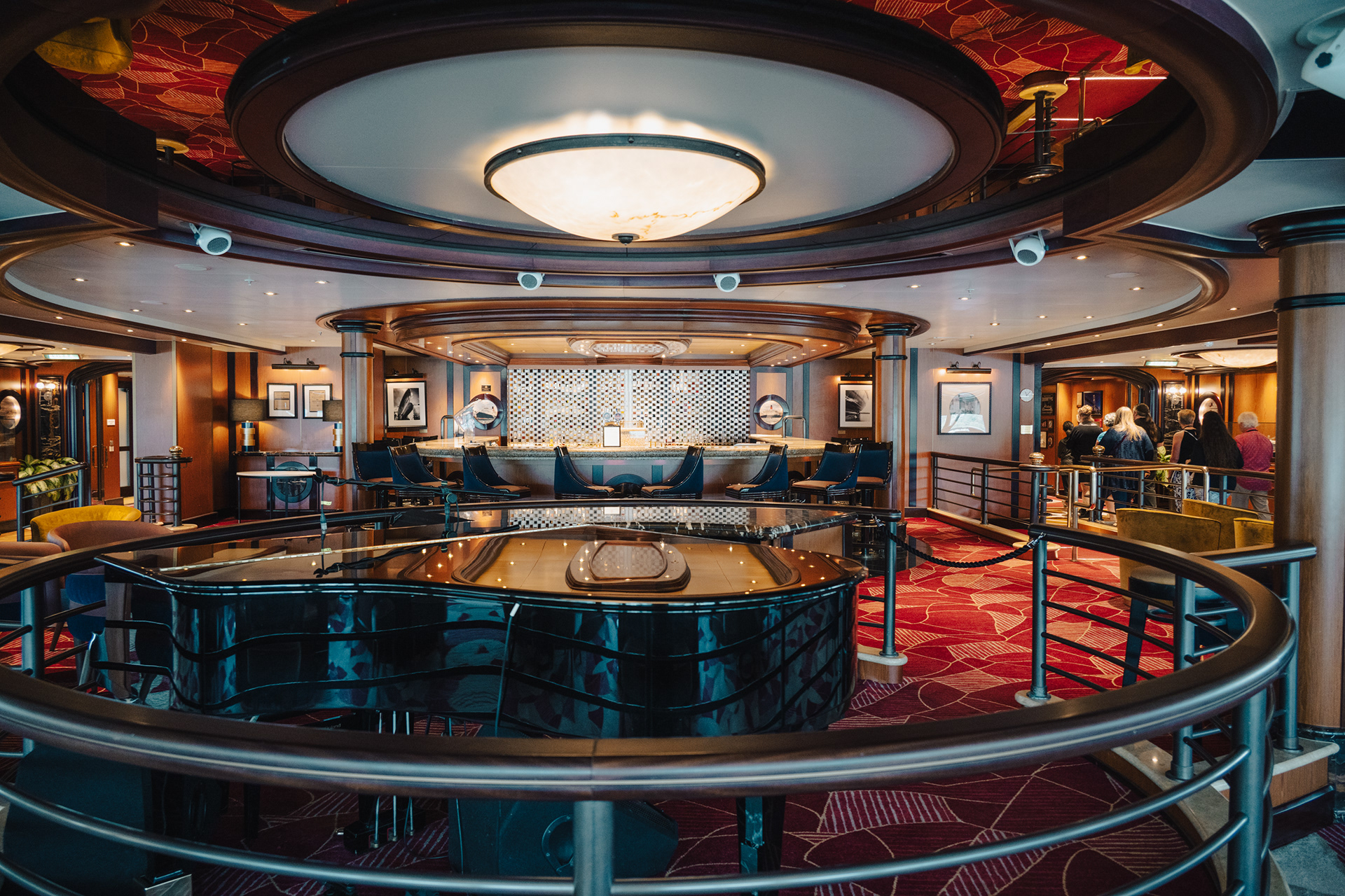 Our tour took us through the sophisticated heart of the vessel, starting with the Grand Lobby, a stunning three-story atrium featuring a marquetry panel of the original Queen Elizabeth liner. We explored the unique Games Deck where guests can play croquet and bowls under the open sky, peeked into the famous two-story Library with its iconic wooden spiral staircase, and admired the Queens Room, the largest ballroom at sea. To top off the experience, we watched part of a show in the ship's theatre and enjoyed a delicious lunch at the elegant Britannia Restaurant. Whether you're a fan of maritime tradition or just looking for a refined escape, the Queen Elizabeth offers a timeless glimpse into the art of cruising.